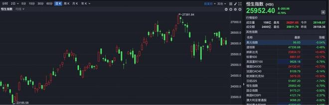 11月4日,港股市场早盘一度延续反弹,但午后再次回落,最终各类指数均显著下跌。 截至收盘,恒指报收于25952.40点,下跌205.96点,跌幅0.79%。 银行股逆势走强,中国光大银行涨超3%,民生银行、招商银行涨超2%,交通银行、工商银行、建设银 行等涨超1%。 其他方面,盘面上,科网股跌多涨少,小米、京东跌超2%,百度涨近3%;石油股延续涨势,中石油一 度涨超3%,但尾市涨幅收窄。 资金方面,截至收盘,南向资金净买入港股金额超98亿港元。 | 分时 2日 = 5分 15分 30分 60分 图形 周K 月K 第K = | 目製粒 · 和生 · ■ / : 恒生指数 (HSI) | | | | | | --- | --- | --- | --- | --- | --- | | 悟生脂数 均线 = | 0000 | | 25952.40 **** | | + | | | -27381.84 | | 的情报价 | | | | | | 27000.0 | 成交量 158亿 品高 | 21291.45 今日 | 20148.07 | | | | | 成交流 2400亿 最低 | 25011.78 首歌 | 2615 ...