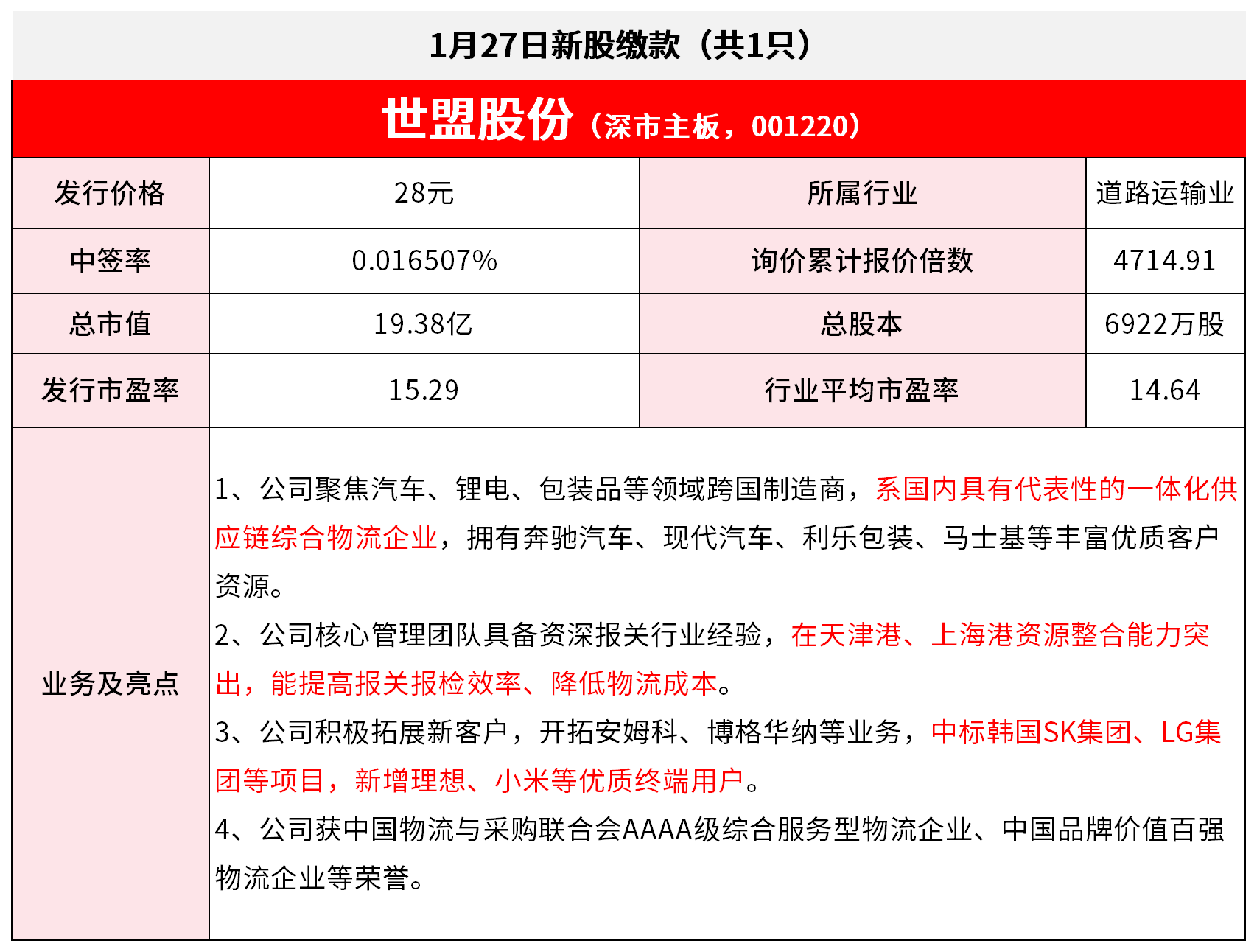 *风险提示:股市有风险,入市需谨慎 | | | In a marting and the many of the many of the many of the many of the many of the many of the seen of the send of the seen the seen the seen of the seems of the seems of the s | | | --- | --- | --- | --- | | 发行价格 | 28元 | | | | 中签率 | 0.016507% | | 询价 | | 总市值 | 19.38亿 | | | | 发行市盈率 | 15.29 | | 行」 | | 业务及亮点 | 1、公司聚焦汽车、锂电、包装品等领域跨国制造 应链综合物流企业,拥有奔驰汽车、现代汽车、i | | | | 资源。 | | | | | | 2、公司核心管理团队具备资深报关行业经验,在 | | | | | 出,能提高报关报检效率、降低物流成本。 | | | | | 3、公司积极拓展新客户,开拓安姆科、博格华乡 | | | | | 团等项目,新增理想、小米等优质 ...
