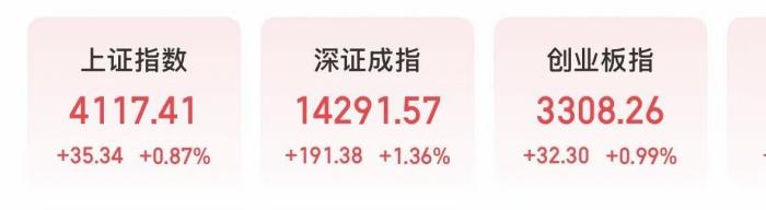市场整体表现 - 马年首个交易日A股三大股指集体上涨 沪指涨0.87%报4117.41点 深成指涨1.36%报14291.57点 创业板指涨0.99%报3308.26点 [1] - 全市场超4000只个股上涨 全天成交额约2.2万亿元 较前一交易日有所放量 [4] 行业板块表现 - 能源设备 石油天然气 海运 化肥农药等行业板块涨幅居前 [4] - 概念板块方面 培育钻石 玻璃纤维 磷化工 油气开采等表现亮眼 [4]