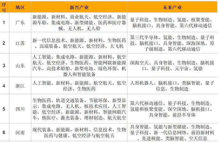 文章核心观点 - 通过对全国31个省(区、市)“十五五”规划建议的梳理,揭示了一张围绕新兴产业和未来产业进行密集交织与错位布局的“产业地图”,预示着中国区域经济版图将在未来五到十年因这些硬核产业的角逐与协同而迎来深刻重塑 [1][10] 热门产业分布 - **新兴产业**:低空经济是覆盖范围最广的产业,超过28个省份明确将其列为重点发展产业 其次是新材料、新能源、生物医药,分别有25、24、24个省份重点提及 [2] - **未来产业**:生物制造是覆盖率最高的未来产业,出现在26个省份的名单中 紧随其后的是具身智能和氢能,分别有20和19个省份重点布局 [4] 区域产业布局特色 - **沿海经济大省(粤苏鲁浙)呈现“全能型”布局**:广东在巩固新能源车船、集成电路、新型储能等优势产业的同时,押注核聚变能和第六代移动通信(6G)等未来产业 江苏除了布局新一代信息技术、航空航天,特别强调了“深海深地”与“原子级制造” [6] - **沿海经济大省(粤苏鲁浙)呈现“全能型”布局**:山东将智能网联新能源汽车和绿色环保置于突出位置 浙江则集中资源于人形机器人和类脑智能 [7] - **中西部省份依托自身禀赋锻造长板**:四川凭借历史积累强化在核技术应用、航空航天等领域的优势,并前瞻布局深空深地探测 湖北以“光谷”为核心打造光电子信息万亿产业集群,并围绕“北斗”打造空天信息生态 [8] - **中西部省份依托自身禀赋锻造长板**:安徽依托国家科学中心,将量子科技加速推向产业化,并积极拓展低空经济与商业航天 河南、陕西、江西等省份在高端装备、新型显示、航空制造等细分领域深耕 [8] 未来产业集群 - 全国蓝图已清晰形成六大具备颠覆性潜力的未来产业集群 [9] - **智能融合集群**:以人工智能、具身智能、脑机接口为核心,主要策源地包括浙江、北京、上海、湖北、安徽等地 [9] - **量子信息集群**:以量子计算、量子通信、量子测量为代表,安徽、北京、上海、广东等地处于研发与产业化前沿 [9] - **未来能源集群**:以氢能、新型储能、核聚变能为方向,内蒙古、四川、辽宁、甘肃等资源或技术大省投入积极 [9] - **空天深海集群**:涵盖商业航天、低空经济、深海装备,广东、江苏、浙江、山东等沿海省份与四川、陕西等内陆航天重镇共同发力 [9] - **生命科学集群**:以合成生物、基因与细胞治疗、脑科学为引领,上海、广东、江苏、湖北等地优势明显 [9] - **先进材料集群**:以前沿新材料、原子级制造、超导技术为基础,江苏、浙江、辽宁、江西、陕西等地重点布局 [9]