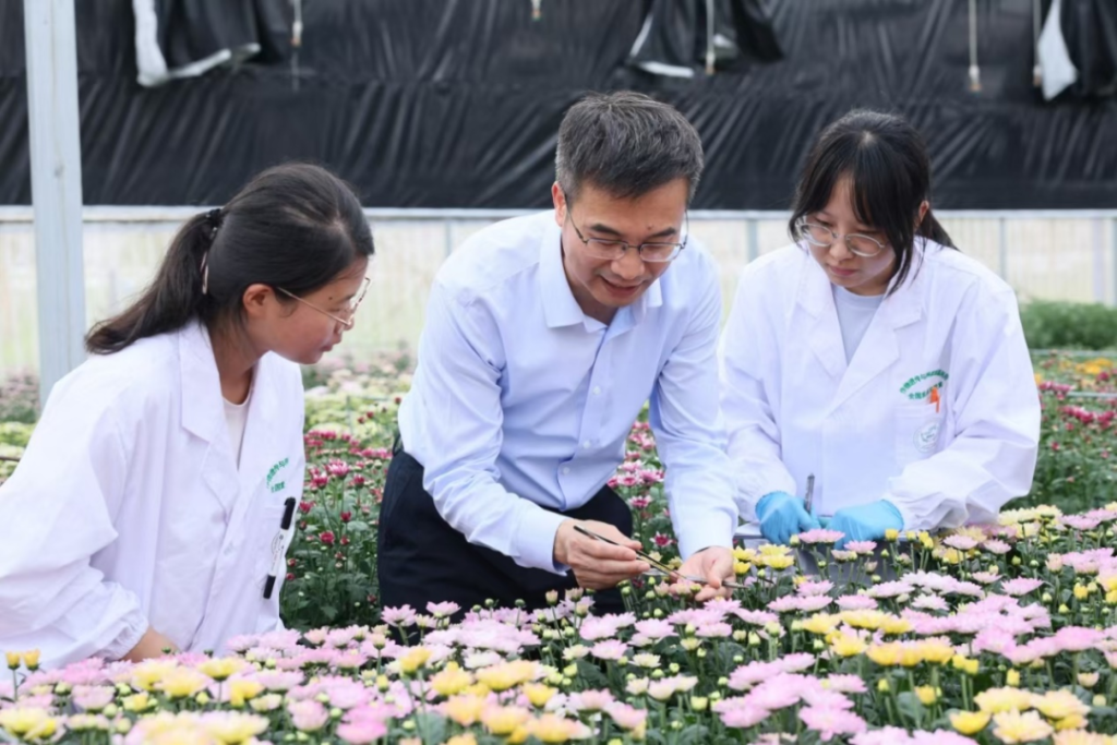 加快培育自主品种的同时,团队也积极联合龙头企业共建育繁推示范基地,实现从实验室到货架的"加速跑"。 南京农业大学校长、菊花遗传与种质创新利用团队负责人陈发棣介绍说,菊花原产中国,是我国传统名花和世界四大切花之一,但曾经很长 时间,产业却面临"卡脖子"困境——切花菊等商业品种95%以上依赖进口,且品种单一、抗性差,野生和近缘种质资源分布零散、家底不清、性 状不明,优异资源挖掘滞后,自主品种选育严重迟缓。 立志培育出优质抗逆、适应产业需求的自主品种,以陈发棣为牵头人的南京农业大学菊花遗传与种质创新利用团队从上世纪90年代起正式开 启菊花遗传育种研究。从云贵高原到青藏冰川,从东海之滨到西北荒漠,团队成员们对野生菊花资源进行系统搜集、整理、保存与评价。 在这些珍贵资源基础上,近年来,团队持续选育出不同花期的切花菊、园林小菊、盆栽小菊等系列新品种400余个,为"中国花"用"中国种"提 供了品种支撑。截至2025年,团队育成的切花菊、园林小菊品种已分别占我国市场上相关商业化品种的30%和60%,辐射70%的产区,打破了国外 品种垄断。 南京农业大学校长、菊花遗传与种质创新利用团队负责人陈发棣指导学生开展菊花杂交育种。(受 ...