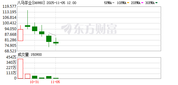 跌、跌、跌!刚刚辗转到港股上市不久的八马茶业,走出多连阴,在连续三个交易日股价下跌后,11月5日早盘再度大幅震荡下行。 11月5日,八马茶业开盘报79港元/股,随后大幅震荡,一度摸高至83.95港元/股,随即探底至75港元/股,盘中振幅达11.33%。 10月28日,八马茶业在港交所上市,上市后股价一度冲高至115港元,但好景不长,10月31日起,八马茶业股价开始回调,至今已从高位回落超30%。 分析人士认为,这一表现或与八马茶业上市仅两天就迫不及待申请H股全流通计划有关。公司上市前进行了多轮融资,股东较多,短期减持压力较大。此 外,港股市场上,同为茶企的澜沧古茶和天福均处于破发状态,最新股价分别较发行价下跌约七成和约五成。除了担忧二级市场抛压增加外,八马茶业业 绩增速放缓、门店扩张乏力,也让投资者不敢"久拿"。 申请H股全流通 八马茶业成立于1997年,在招股书中,公司自称是"2024年中国最大的高端茶业供应商",主要销售茶叶及茶具、茶食、茶饮等非茶叶产品,在全国共有 3716家线下门店。 在过去的十余年里,八马茶业曾三度谋求A股上市,均以失败告终。今年1月17日,八马茶业向港交所递交了招股书,并于10月2 ...