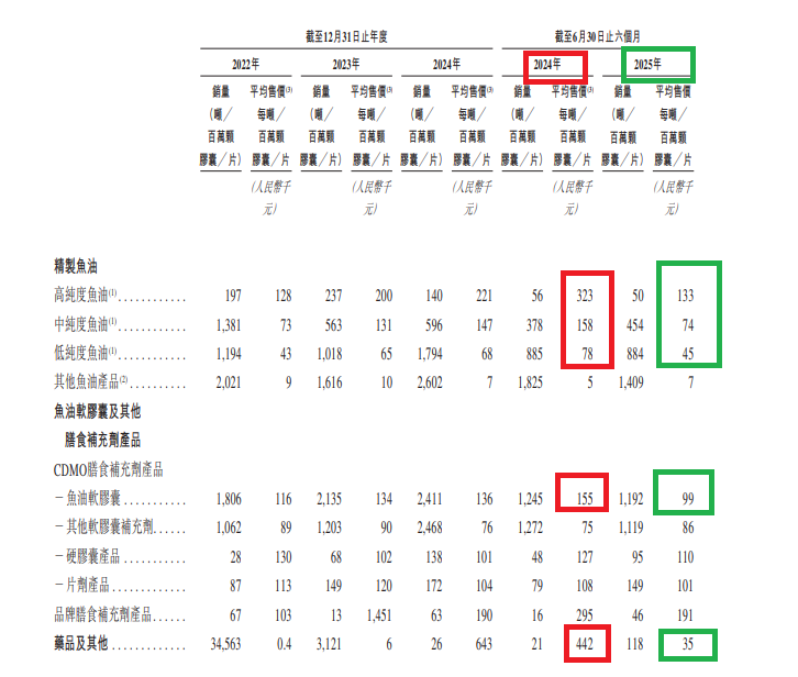 公司财务表现 - 2025年上半年公司收入为3.43亿元,同比下降27.13%,净利润为0.23亿元,同比下降74.01% [3] - 2022年至2024年公司收入分别为5.34亿元、6.61亿元、8.32亿元,净利润分别为0.67亿元、1.02亿元、1.25亿元 [3] - 公司毛利率从2022年的25.4%波动至2025年上半年的20.7%,2025年上半年毛利率显著下滑 [3] 核心产品价格与销量 - 高纯度鱼油2025年上半年平均售价为每吨/百万颗133千元,较2024年同期的323千元下降58.82% [4][5] - 中纯度鱼油2025年上半年平均售价为每吨/百万颗74千元,较2024年同期的158千元下降53.16% [4][5] - 低纯度鱼油2025年上半年平均售价为每吨/百万颗45千元,较2024年同期的78千元下降42.31% [4][5] - 鱼油软胶囊2025年上半年平均售价为每吨/百万颗99千元,较2024年同期的155千元下降36.13% [4][5] 资产负债与分红 - 公司资产负债率2024年高达90.39%,2025年上半年为83.24% [1][7] - 公司在2024年12月宣派股息3.2亿元,该金额超过2022-2024年度净利润之和2.94亿元,且相当于2024年末净资产0.41亿元的近8倍 [1][9][10][11] - 3.2亿元分红全部流向由刘汝萃、刘丕谨及刘锡潜控制的实控人家族 [11] 行业市场状况 - 2020年至2024年食品级鱼油的全球市场规模复合年增长率为-6.76% [5] - 预计2025年至2029年食品级鱼油的全球市场规模复合年增长率为6.65% [5] - 以2024年销量计,公司是全球最大的食品级精制鱼油供应商,市场份额为8.1% [3] 客户依赖与内控问题 - 2022-2025年上半年公司向贸易公司的销售额占同期收入比例分别为53.5%、62.4%、58.1%、52.1% [6] - 报告期内公司违法票据融资金额合计1.59亿元,偏离贷款资金预定用途金额累计2.42亿元,两项违规合计超4亿元 [2][12][13] - 公司将违规融资原因归咎于财务经理的不妥建议,并表示不熟悉相关监管规定 [2][13][15]