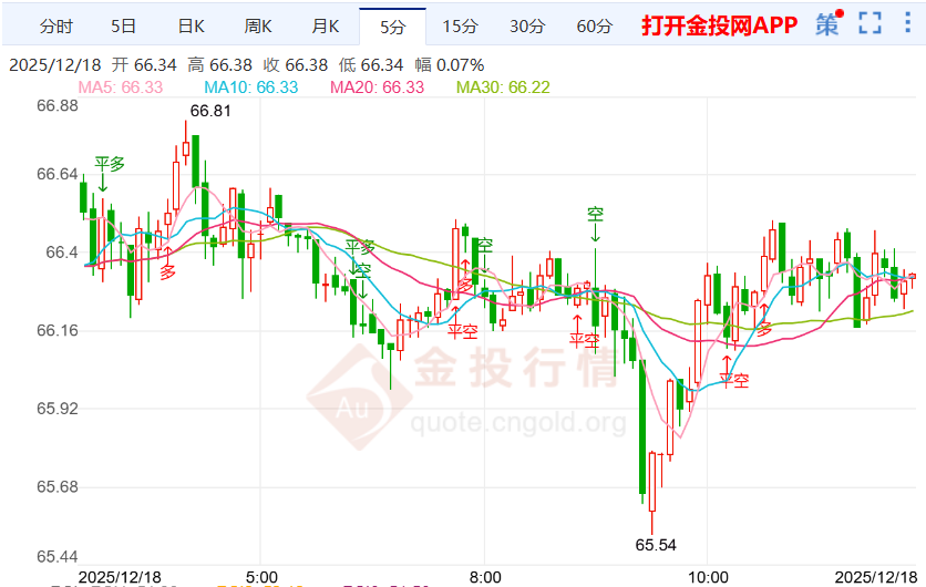 今日周四(12月18日)亚盘时段,国际白银目前交投于66.17一线上方,今日开盘于66.21美元/盎司,截至发稿,国际白银 暂报66.35美元/盎司,上涨0.27%,最高触及66.50美元/盎司,最低下探65.54美元/盎司,目前来看,国际白银盘内短线 偏向震荡走势。 特朗普试图通过宣传他在其他问题上的工作来提高其支持率,他说,他在支持军队和促成加沙停火的同时,阻止了无 证移民和毒品的流入。"我们正在取得进展。没人能相信发生了什么,"特朗普说。 【最新国际白银行情解析】 隔夜突破64.00美元附近的水平阻力被视为国际白银多头的关键触发因素,并验证了短期的积极前景。该水平现在与100 小时简单移动平均线(SMA)的关键支撑重合,这反过来应该为该商品提供强有力的基础,并成为短期交易者的关键枢 纽点。 相对强弱指数(RSI)在1小时图上显示为59.95,处于中性至看涨状态,尽管在日线图上显示出超买状态。 此外,100小时SMA的上升斜率表明,任何修正性下滑更可能吸引逢低买入。保持在上升的SMA之上将维持国际白银 的上行趋势,而若果断跌破该支撑位,则将开启更深的回调。MACD回归正区间,以及RSI保持在50以上将增强 ...
