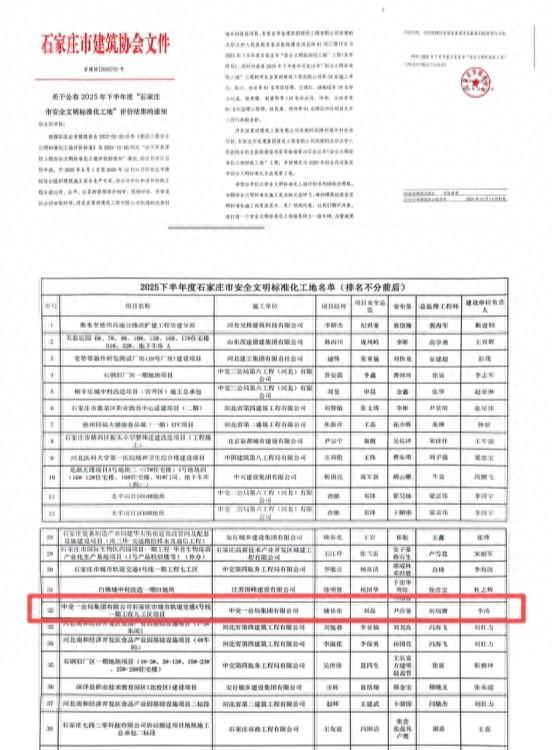 来源:环球网 近日,石家庄地铁4号线一期工程九工区项目成功获评2025年下半年"石家庄市安全文明标准化工地", 标志着项目在安全文明施工标准化管理方面达到行业领先水平。 | | | 2025下半年度石家庄市安全文明标准化工地名单(排名不分商后) | | | | | | | --- | --- | --- | --- | --- | --- | --- | --- | | 18:47 | 印度10 | ML. I. (A EQ. | AN VIPELERY | 明川反全身 C | 留青部 | DARCHH | 使维和位负责 A | | 11 | 图来影视剧情用的接动。据工结对推荐榜图 | MIES MENTHER MAN DE VALUE TO COL | 144 WASSE | ALER IN | 01174 118 | BU PALINE | 001-102-01-0 | | 1 | 凡都出版 60、 78、 90、 108、 138、 109、 1780 10 114, J220, M. F.T.B. A | NU A FLOCAL DE LE ALL BE SELECT PRO CO THE PER | ...