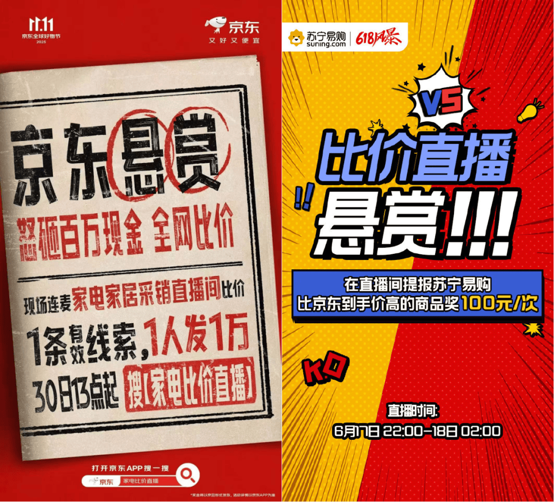那时候,刘强东几条免费的微博引得全国数百家媒体趋之若鹜,成功将用户的家电购买习惯从线下引导至线上,可谓大获全胜。 今天的京东,还拿老板十年前的卷子抄答案,难怪双十一前京东零售营销负责人被换掉。 这两天,刘强东和章泽天在韩国的照片传出,不出意料的成为热门话题。这熟悉的配方不得不让人想起十多年来,刘强东一直擅长的造势方法。 只不过,看得多了总让人有点审美疲劳。联想到前几天某自媒体大V的转文,本来对京东和双十一无感,看完竟有点嫌弃。 怎么个事儿呢?这是一篇京东双十一的推广文,说的是京东悬赏百万现金,号召网友全网比价。 在京东家电家居采销直播间,网友连麦主播,提供一条京东售价比其他平台贵的有效线索,即可获得一万元奖励。 左为京东2025双十一比价海报,右为苏宁易购2020年618比价海报 怒砸百万、全网比价的用语,配上复古的海报设计,瞬间给人带回十年前。从用词用语到视觉呈现,从活动立意到玩法设计,都是十多年前各家玩烂的套 路了。 对比之下,2012年刘强东微博一声令下,招聘大爷大妈去苏宁国美门店比价的玩法,不知道要高明到哪里去了。 如此雷同的传播套路,可能是独立BU的传播部门在做,但从外部感受来看,京东的传播还是乏味 ...