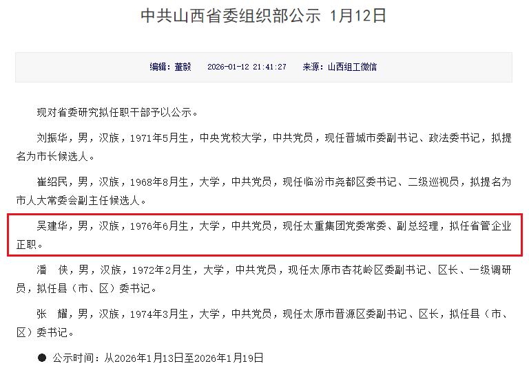 人事任命 - 2026年1月12日,中共山西省委组织部公示,现任太重集团党委常委、副总经理吴建华拟任省管企业正职 [1][5] - 2026年1月10日,太重集团2025年度经济运行工作总结会议显示,原总经理陶家晋已履职太重集团党委书记、董事长,目前总经理职位空缺 [3][8] 新任管理者背景 - 吴建华出生于1976年6月,正高级工程师,兼具党务管理与技术创新双重能力 [3][7] - 2021年获山西省“全省优秀党务工作者”荣誉称号 [3][7] - 曾任太重集团技术中心党委书记、主任,主导建立了智能采矿装备技术全国重点实验室等创新平台 [3][7] - 带领团队攻克多轴线桁架臂起重机等关键核心技术 [3][8] - 其负责的焦炉设备远程控制系统实现行业智能化突破 [3][8] - 2022年4月被提名为太重集团副总经理 [3][8] 公司研发与创新成果 - 截至2024年,吴建华推动集团研发投入年均增长25%,累计达40亿元 [3][8] - 在其推动下,公司形成了“揭榜挂帅”等创新机制 [3][8] - 公司技术中心在2022年以90.9分获国家级优秀评价 [3][8] 公司历史与地位 - 太重集团始建于1950年,是新中国自行设计、建造的第一座重型机器厂,属于国家特大型骨干企业 [4][8] - 1998年创立了重机行业第一家上市公司——太原重工股份有限公司 [4][8] - 2005年进入中国制造业500强,2008年跨入百亿企业行列 [4][8]