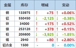 》查看更多金属库存信息 | 地点 | | 前日库存 入库 出库 | | 今日库存 | 变动 | 注册仓单 | 注销仓单 | 注销占比 | | --- | --- | --- | --- | --- | --- | --- | --- | --- | | 倡 | 552575 | 0 | 2125 | 550450 | -2125 | 506950 | 43500 | 7.90% | | 巴生港 | 361375 | 0 | 2125 | 359250 | -2125 | 316925 | 42325 | 11.78% | | 光阻 | 140775 | 0 | 0 | 140775 | 0 | 140775 | 0 | 0.00% | | 高雄 | 45300 | 0 | 0 | 45300 | 0 | 45300 | 0 | 0.00% | | 鹿特丹 | 3575 | 0 | 0 | 3575 | 0 | 2450 | 1125 | 31.47% | | 菜佛 | 1225 | 0 | 0 | 1225 | 0 | 1225 | 0 | 0.00% | | 新加坡 | 275 | 0 | 0 | 275 ...