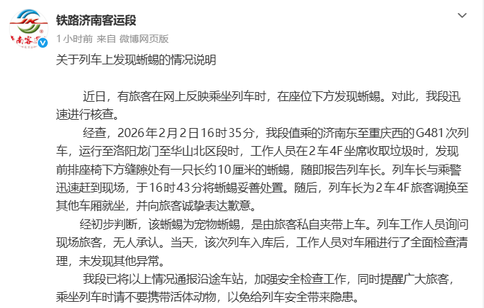 事件概述 - 济南客运段值乘的G481次列车上发现一只宠物蜥蜴 该事件发生于2026年2月2日16时35分 列车运行在洛阳龙门至华山北区段 工作人员在2车4F坐席前排座椅下方缝隙处发现一只长约10厘米的蜥蜴 [1] - 列车工作人员与乘警迅速响应 于16时43分将蜥蜴妥善处置 随后列车长为涉事座位旅客调换车厢并就此事向旅客诚挚道歉 [1] - 经初步判断 该蜥蜴为旅客私自夹带上车的宠物蜥蜴 现场询问无人承认 列车入库后工作人员对车厢进行了全面检查清理 未发现其他异常 [1] 公司应对与处置 - 济南客运段在事件发生后迅速进行核查并发布情况说明 表明了对旅客反馈的重视和快速反应机制 [1] - 公司工作人员在发现异常后立即报告列车长 列车长与乘警迅速赶到现场处理 体现了既定的应急处理流程 [1] - 公司后续采取了旅客安置和全面检查措施 包括为受影响旅客调换座位 以及列车入库后对车厢进行全面检查清理 以消除潜在影响并保障后续运营安全 [1]