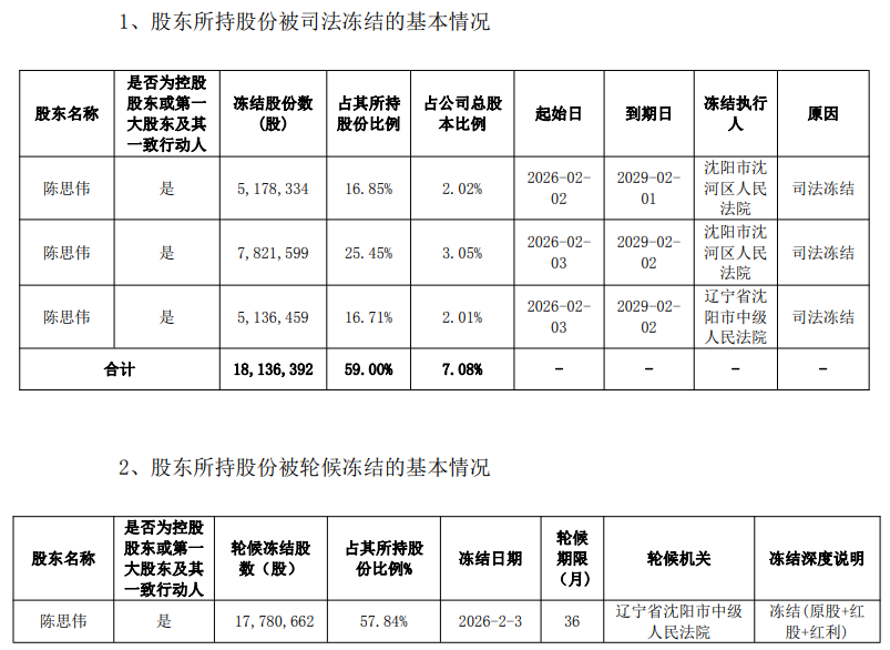 核心事件:控股股东股份被司法及轮候冻结 - 公司控股股东陈思伟所持部分股份被司法冻结及轮候冻结 [1] - 股份冻结的具体原因为公司银行借款逾期,陈思伟为公司授信融资提供了连带责任担保,债权人申请诉讼保全 [5] - 截至公告日,陈思伟尚未收到关于司法冻结的任何法律文书、通知或其他信息 [5] 股份冻结详情 - 陈思伟被司法冻结的股份数量为1814万股,占其所持股份的59%,占公司总股本的7.08% [1] - 陈思伟被轮候冻结的股份数量为1778万股,占其所持股份的57.84% [1] - 陈思伟累计被冻结股份为3074万股,占其持股的100%,占公司总股本的12% [1][3] - 冻结执行机关包括沈阳市沈河区人民法院和辽宁省沈阳市中级人民法院 [2] 公司财务状况与债务问题 - 公司及子公司深圳市萃华珠宝首饰有限公司因流动资金紧张,出现部分借款逾期 [6] - 截至公告披露日,公司及深圳萃华在银行等融资机构的借款逾期本金合计为2.34亿元 [6] - 若公司银行借款逾期未能及时解决,控股股东可能面临诉讼、仲裁、被要求履行连带担保责任等风险 [5] 近期其他股东股份冻结情况 - 公司持股5%以上股东深圳市翠艺投资有限公司及一致行动人所持公司部分股份被司法冻结、司法再冻结及轮候冻结 [6] 公司2025年度业绩预告 - 公司预计2025年全年归属于上市公司股东的净利润为2100万元至3100万元,同比预减85.69%至90.31% [7][8] - 公司预计2025年全年扣除非经常性损益的净利润为1.62亿元至2.42亿元,同比预增154.81%至280.64% [7][8] - 预计基本每股收益为0.08元/股至0.12元/股 [8] 业绩变动原因分析 - 珠宝板块业务受黄金行情上涨影响,经营业绩有所增长 [9] - 锂盐板块转亏为盈,经营业绩有所增长 [9] - 控股子公司思特瑞锂业转让磷氟锂业2%股权,导致合并报表范围变动及商誉减少,此变动属于非经常性损益 [9] - 公司期末确认业绩承诺事项,预计净利润增加,此变动属于非经常性损益 [9] 公司主营业务 - 公司主营业务是珠宝饰品设计、加工、批发和零售和锂盐产品的生产、销售和加工 [6] - 主要产品包括黄金产品、铂金产品、镶嵌产品、其他珠宝、黄金加工、锂产品、锂产品加工 [6]