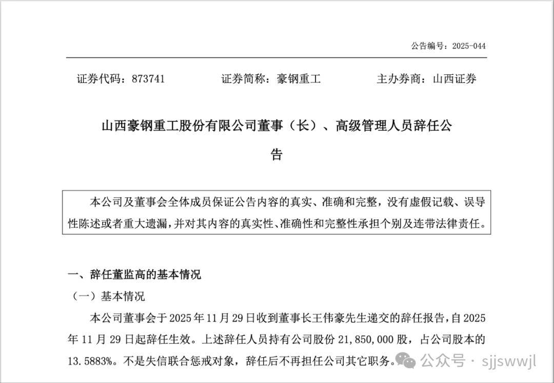 核心事件概述 - 2025年12月2日,新三板挂牌公司豪钢重工公告,董事长兼总经理王伟豪、董事王瑞、董事张瑞娟递交书面辞职报告,辞任自11月29日起生效 [1] - 三位辞任人员合计持有公司股份118,241,405股,占公司总股本的比例高达73.5332% [3] - 公司公告称,辞任原因为“个人原因”,且不会对公司生产、经营产生不良影响,董事会成员不低于法定最低人数 [3] 管理层变动详情 - 董事长王伟豪上任仅约半年,其于2025年5月16日接替其父王瑞当选董事长并兼任总经理 [5] - 此次王瑞、张瑞娟、王伟豪三人集中辞任,距离王伟豪接任董事长仅约半年时间 [5] - 三位辞任人员均非失信联合惩戒对象,且辞职后不再担任公司任何职务 [3] - 豪钢重工是一家典型的家族式企业,实际控制人为王瑞、张瑞娟夫妇及其子女王伟豪、王伟倩,四人直接持有公司股份比例高达85.8% [5] 公司财务与经营状况 - 据2025年上半年财报,公司营收与净利润同比分别下降15.33%和31.14% [5] - 在业绩走弱背景下,公司仍实施高分红:2024年度与2025中期分别派现9648万元和3216万元 [5] - 以实控人王瑞家族85.8%的持股比例计算,其共计获约1.10亿元分红,该金额与此前IPO募资计划中1.1亿元的补流额度相当 [5] - 公司成立于2010年,是一家专业化锻造企业,被认定为“国家级专精特新小巨人” [3] 北交所IPO进程回顾 - 公司资本市场征程一波三折:2017年挂牌新三板,2019年摘牌,2021年曾计划申请沪深交易所IPO,后于2022年8月重新挂牌新三板,目标明确为北交所 [7] - 2023年11月,公司正式向北交所报送上市申报材料并获得受理 [7] - 申报期内(2022年及2023年),公司营业收入分别为4.16亿元和4.30亿元,归母净利润分别为1.16亿元和1.13亿元,毛利率持续维持在40%以上 [7] - 2024年1月至9月间,北交所就公司IPO申请累计发出三轮审核问询函,问题集中于业绩增长可持续性、募集资金用途合理性及上市前大额分红等 [7] - 2024年11月25日,公司董事会审议通过终止北交所上市并撤回申请材料的议案,解释称系基于当前资本市场环境并结合自身战略发展规划 [8] - 北交所于2024年12月20日正式下发终止审核决定 [8] - 豪钢重工未登上2025年7月山西省委金融办发布的《关于2025年度省重点上市后备企业名单的公示》 [8] 行业与地区背景 - 截至目前,在北交所上市的山西企业共有三家,分别是科达自控、大禹生物、锦波生物 [9] - 多家冲刺北交所的新三板企业进行了“撤回”操作 [10] - 例如,腾茂科技于2024年4月被北交所终止上市审核 [11] - 此外,宇林德、牧同科技、风行测控、金兰股份、新环精密、佳维股份等山西新三板企业均计划登陆北交所 [11]