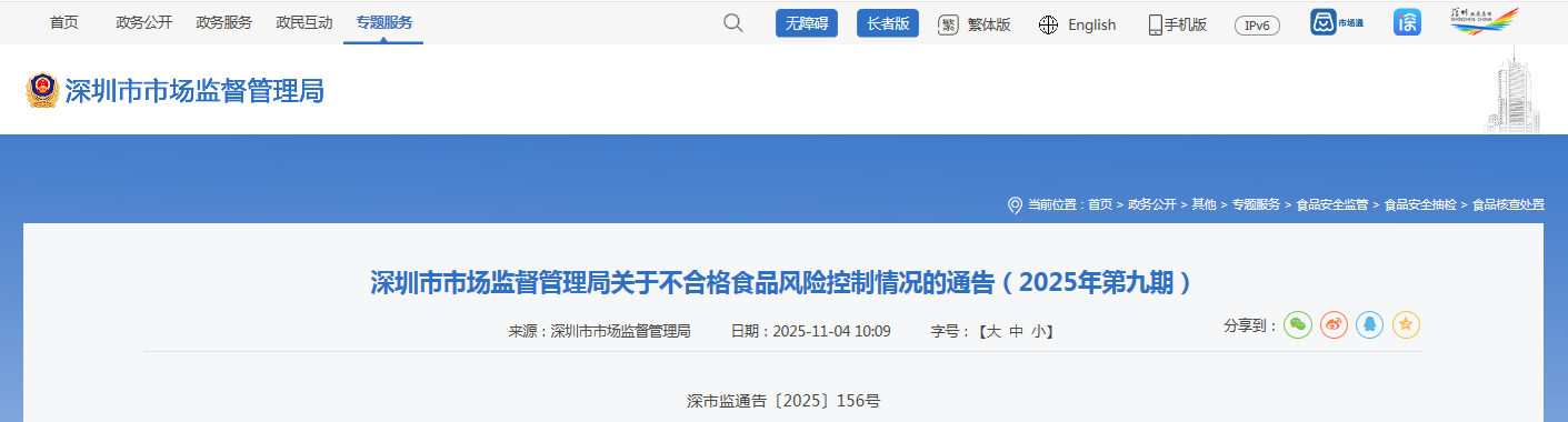 深圳市市场监督管理局关于不合格食品风险控制情况的通告(2025年第九期)