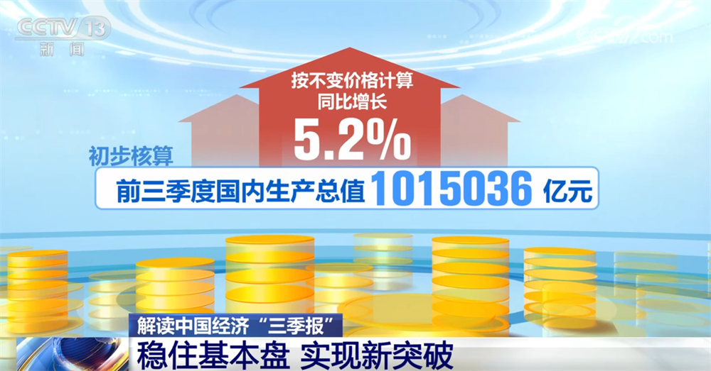 透视中国经济"三季报"释放的重要信号 中国经济"三季报"20日最新出炉:前三季度,国内生产总值(GDP)1015036亿元,按不变价格计算,同比增长5.2%。其中,三季度增长 4.8%。 这些重要数据的背后透出了哪些信号? 信号一:中国经济延续稳中有进态势 前三季度,中国经济运行总体表现如何? 国家统计局新闻发言人用三个"没有变"作出评价—— "经济平稳运行的主基调没有变""高质量发展扎实推进的态势没有变""经济韧性强潜能大的基本特性没有变"。 看经济增长: 前三季度GDP同比增长5.2%,比上年全年和上年同期分别加快0.2、0.4个百分点;经济增量达39679亿元,同比多增1368亿元。 对中国这样超大体量的经济体而言,保持稳定发展已属不易,在各种风险挑战交织背景下仍体现了坚强韧性,则更显可贵。 再看就业物价: 前三季度,全国城镇调查失业率平均值为5.2%,与上半年持平;全国居民消费价格指数(CPI)同比略降0.1%,但扣除食品和能源的核心CPI 上涨0.6%,其中9月上涨1.0%,涨幅连续5个月扩大。 最后看国际收支: 货物进出口规模创历史同期新高,增速逐季回升;9月末外汇储备继续保持在3.3万亿美元以上 ...