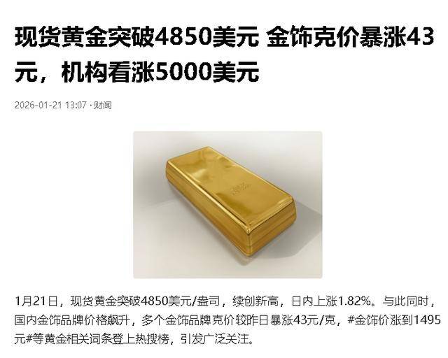 小毋今天想给大家好好聊一聊,1月21日,国际金价突破4850美元/盎司的消息刷了屏,可评论区里全是 犹豫的声音,有人说等回调,有人怕站岗,还有人根本没把黄金当回事。 短线疯涨:地缘冲突+降息,情绪推着价格飞 另一边,世界黄金协会刚出炉的最新数据显示,2023到2025年这三年,全球央行年均购金量超1000吨, 进入2026年依旧在持续加仓,一边是普通民众持币观望、犹豫不决,一边是各国央行大手笔扫货黄金, 这背后的门道,到底谁真正看明白了? 黄金不是普通商品,涨跌背后全是门道,下面就把金价暴涨的短、中、长三条逻辑讲透,再告诉你普通 家庭该怎么配,配多少才不踩坑,毕竟现在的金价,早不是"买根项链保值"那么简单了。 此次金价一举突破4850美元关口,短期市场情绪成为核心推手,而这股情绪的背后,源于三件事的接连 发酵,每一件都狠狠戳中了市场的避险神经。 先是格陵兰岛的领土争端持续升级,特朗普前脚刚晒出将格陵兰划入美国版图的挑衅图片,后脚又放话 要对北欧国家加征200%的高额关税。 这般强硬到极致的姿态,直接让全球市场陷入恐慌,纽约商品交易所的黄金期货成交量,单日较前一日 暴涨30%。 市场资金纷纷涌入黄金市场寻求心安 ...