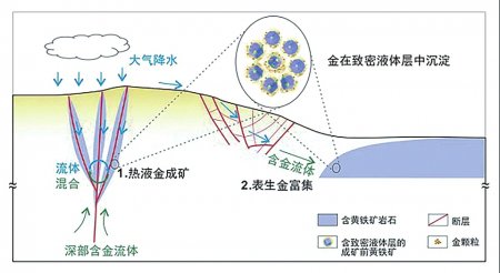 热液成矿与表生富集过程中致密液体 反应过程中,黄铁矿周围出现黄金纳米颗粒。 作为稀有金属和贵金属,也是全球金融储备的硬通货,黄金广受追捧,与黄金相关机制的研究也备受学 界关注。 日前,中国科学院广州地球化学研究所联合江西省科学院、厦门大学、东华理工大学等机构的科学家, 利用原位液相透射电子显微镜技术,首次从纳米尺度原位报道了自然界中金纳米颗粒在黄铁矿表面形成 的动态过程,并提出了一种黄铁矿诱导金沉淀的新机制。简单来说就是:黄金可以"长"出来。相关成果 于北京时间1月23日发表于国际学术期刊《美国科学院院刊》。 发现更温和的"炼金术" 科学家首次揭示纳米黄金形成动态过程 层内金富集的示意图。 这项突破性的发现,揭示了自然界中还存在另一种更温和的"炼金术",用常见矿石黄铁矿也能"炼出黄 金"。当地表水或地下热液在岩石裂隙中流动时,它们就像一支天然的运输队,将古老地质活动形成的 金矿进行氧化溶解,形成可溶性的含金络合物进入流体,从而开始了漫长的迁移之旅。 科学家研究发现,当这种特殊的流体流过黄铁矿表面时,会在其界面形成一个神奇的"纳米工厂"。这个 工厂拥有超强的吸附力,能像磁石一样,从稀薄的流体中精准捕获、汇聚金原 ...