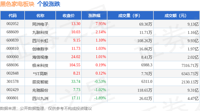 从资金流向上来看,当日黑色家电板块主力资金净流出1.6亿元,游资资金净流出729.27万元,散户资金 净流入1.67亿元。黑色家电板块个股资金流向见下表: 证券之星消息,12月26日黑色家电板块较上一交易日上涨0.28%,兆驰股份领涨。当日上证指数报收于 3963.68,上涨0.1%。深证成指报收于13603.89,上涨0.54%。黑色家电板块个股涨跌见下表: | 代码 | 名称 | 收盘价 | 涨跌幅 | 成交量(手) | 成交额(元) | | | --- | --- | --- | --- | --- | --- | --- | | 002429 | 兆驰股份 | 7.81 | 4.27% | 163.76万 | | 12.85 Z | | 000801 | 四川九洲 | 17.44 | 0.75% | 44.23万 | | 7.69亿 | | 000810 | 创维数字 | 11.61 | 0.17% | 10.23万 | | 261T | | 688609 | 九联科技 | 9.82 | -0.20% | 6.71万 | 6575.96万 | | | 600839 | 四川长虹 | 9.05 | -0 ...
