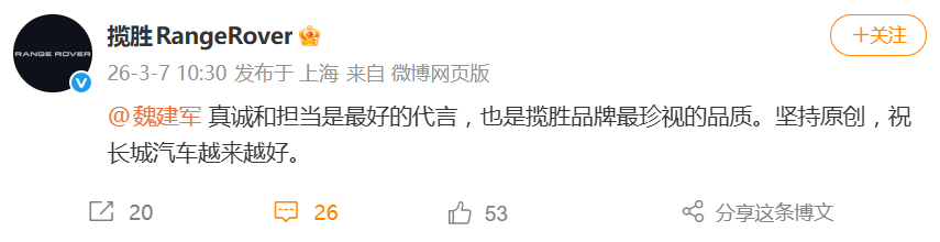 路虎揽胜回应魏建军道歉:真诚和担当是最好的代言,祝长城汽车越来越好