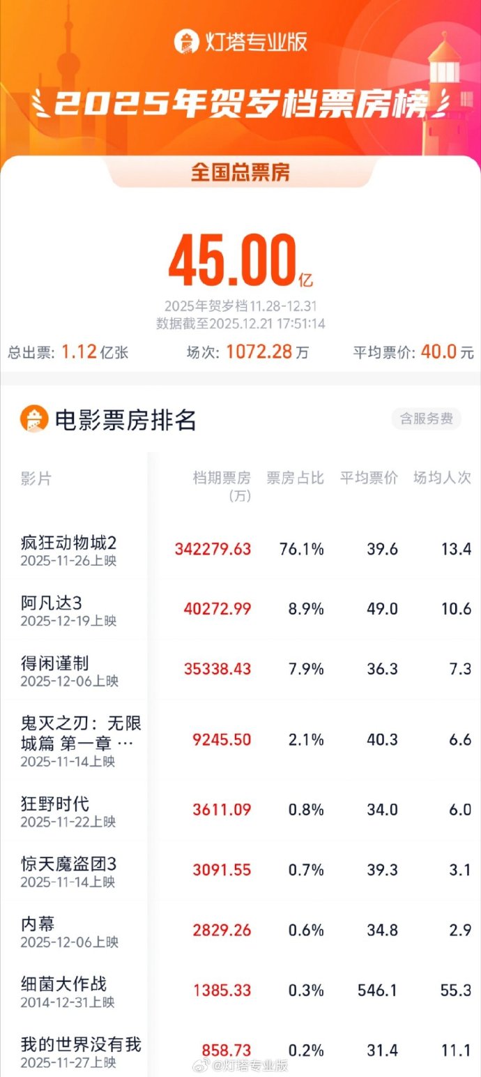 | 鬼灭之刃:无限 城篇 第一章 … | 9245.50 | 2.1% | 40.3 | 6.6 | | --- | --- | --- | --- | --- | | 2025-11-14上映 | | | | | | 狂野时代 | 3611.09 | 0.8% | 34.0 | 6.0 | | 2025-11-22上映 | | | | | | 惊天魔盗团3 | 3091.55 | 0.7% | 39.3 | 3.1 | | 2025-11-14上映 | | | | | | 内幕 | 2829.26 | 0.6% | 34.8 | 2.9 | | 2025-12-06上映 | | | | | | 细菌大作战 | 1385.33 | 0.3% | 546.1 | 55.3 | | 2014-12-31上映 | | | | | | 我的世界没有我 | 858.73 | 0.2% | 31.4 | 11.1 | | 2025-11-27上映 | @ @ 好 : 小 : | | | | 据灯塔专业版,截至12月21日17时51分,2025年贺岁档档期(11月28日-12月31日)总票房(含预售) 突破45亿。 ...