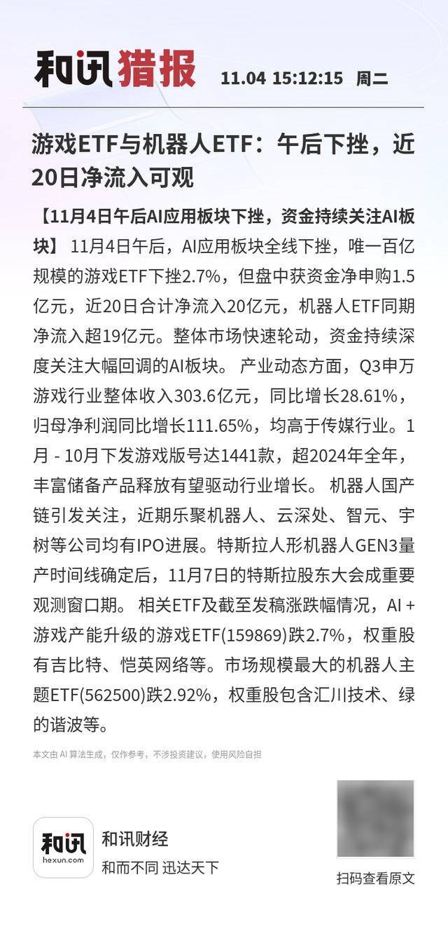 【11月4日午后AI应用板块下挫,资金持续关注AI板块】11月4日午后,AI应用板块全线下挫,唯一百 亿规模的游戏ETF下挫2.7%,但盘中获资金净申购1.5亿元,近20日合计净流入20亿元,机器人ETF同期 净流入超19亿元。整体市场快速轮动,资金持续深度关注大幅回调的AI板块。 产业动态方面,Q3申万 游戏行业整体收入303.6亿元,同比增长28.61%,归母净利润同比增长111.65%,均高于传媒行业。1月 - 10月下发游戏版号达1441款,超2024年全年,丰富储备产品释放有望驱动行业增长。 机器人国产链引 发关注,近期乐聚机器人、云深处、智元、宇树等公司均有IPO进展。特斯拉人形机器人GEN3量产时 间线确定后,11月7日的特斯拉股东大会成重要观测窗口期。 相关ETF及截至发稿涨跌幅情况,AI + 游 戏产能升级的游戏ETF(159869)跌2.7%,权重股有吉比特、恺英网络等。市场规模最大的机器人主题 ETF(562500)跌2.92%,权重股包含汇川技术、绿的谐波等。 和讯财经 和而不同 迅达天下 本文由 AI 算法生成,仅作参考,不涉投资建议,使用风险自担 扫码查看原文 广 时间线佣正后, ...