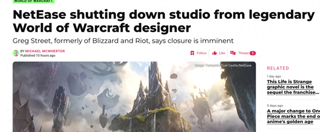 “魔兽世界”首席设计师工作室被网易关闭,曾称“我们很安全”