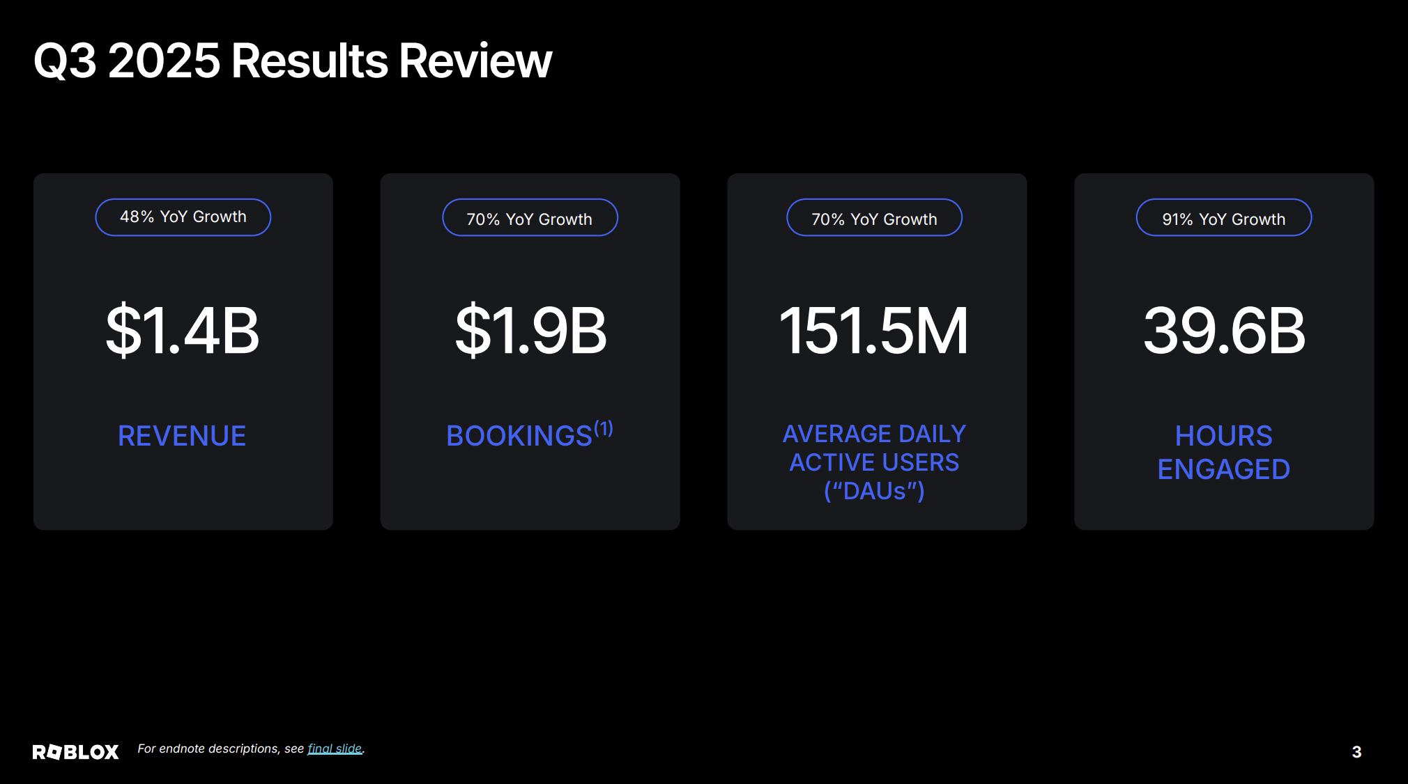 财务表现 - 2025年第三季度营收同比增长48%至14亿美元 [1] - 付费金额的预订营收(Robux总购买额)同比增长51%至19亿美元 [1] - 公司净亏损达2.5亿美元 [6] - 创作者分成支出同比增长85%,基础设施及安全措施费用增长61% [6]   用户增长与参与度 - 日活跃用户(DAU)达到1.515亿,同比增长70% [1] - 总参与时长达396亿小时,同比增长91% [1] - 13岁以上用户DAU同比增长89%,该群体DAU已突破1亿大关 [3] - 13岁以下用户DAU增长44% [3]   区域表现 - 亚太地区(APAC)DAU同比增长108%,用户游戏时长同比增长127%,增幅均为全球之首 [3] - 欧洲地区DAU增长56%,用户游戏时长增长82% [3] - 北美地区DAU增长32%,用户游戏时长增长47% [3] - 其他地区DAU增长80%,用户游戏时长增长109% [3]   运营指标与驱动因素 - 日均活跃用户平均预订销售额(ABPDAU)为12.68美元,与去年同期持平 [3] - 美国/加拿大地区ABPDAU同比增长13%,欧洲地区增长22%,亚太地区增长1%,其他地区增长27% [3] - 用户增长及参与时长提升的主要驱动力源于2025年第二季度以来持续涌现的热门内容,如《Grow a Garden》、《99 nights in the forest》、《Steel a Brainrot》等 [6] - 公司宣布将于2025年9月将创作者分成比例提高7% [6]