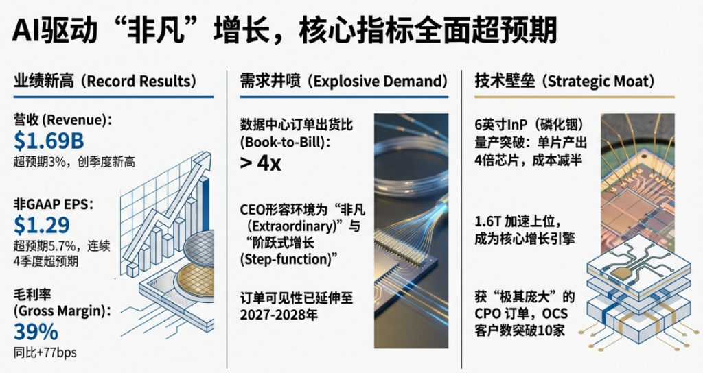 核心财务表现 - 2026财年第二财季调整后每股收益为1.29美元,高于市场一致预期的1.22美元,营收为16.9亿美元,创下季度新高,盈利与收入均实现同比明显增长 [3] - 非GAAP毛利率为39%,环比扩张24个基点,同比扩张77个基点,非GAAP摊薄后每股收益为1.29美元,同比增长35% [38][52][53] - 数据中心与通信部门收入占公司总收入的70%以上,第二季度该部门收入环比增长11%,同比增长34% [39] 市场需求与订单能见度 - 受AI数据中心建设拉动,数据中心相关业务订单出货比(Book-to-Bill)超过4倍,需求可见性延伸至2027年,甚至有大客户的详细预测延伸至2028年 [3][6][15][57] - 公司经历了订单的“阶梯式增长”,目前大部分2026日历年的产能已被预订,订单已快速填充至2027年 [11][15] - 公司预计第三财季营收将在17亿美元至18.4亿美元之间,并预计3月和6月季度都将实现持续强劲的环比收入增长 [15][36] 产品与技术进展:高速光模块 - AI数据中心需求正从800G向1.6T快速切换,800G仍是目前最大收入来源,但1.6T增长速度明显更快,预计两者在2026日历年都将显著增长 [18][21][41] - 1.6T光模块的爬坡正在加速,初期由EML和硅光方案驱动,基于200G VCSEL的1.6T产品将在2024年下半年开始放量 [22][41] - 管理层预计1.6T的毛利率将高于800G,因为新数据速率的ASP通常更高,且生命周期初期毛利率更高 [66] 产能扩张与成本优势 - 公司正在全速推进全球首条6英寸磷化铟生产线的产能扩张,计划在2024年底前将内部磷化铟产能翻倍,目前晶圆投片量已达到翻倍目标的80% [6][23][26][58] - 6英寸磷化铟晶圆相比传统3英寸晶圆,单片晶圆芯片产出提升4倍以上,成本下降约一半,且6英寸线良率已超过旧产线 [6][26][42] - 公司预计磷化铟的供需失衡在2024年或2025年都不会恢复平衡,可能会处于一个非常持久的供需失衡期 [22][69] 下一代技术布局:CPO与OCS - 公司披露从一家市场领先的AI数据中心客户获得了一份“异常巨大”或“极其庞大”的CPO采购订单,该方案采用了公司6英寸线生产的高功率连续波激光器 [6][28][29][45] - 该CPO订单预计将在2024年年底开始产生初始收入,在2025年及以后将有更显著的收入贡献 [45] - 在光路交换领域,OCS平台客户数已超过10家,积压订单在第二季度实现环比增长,管理层认为未来几年超过20亿美元的市场机会预估可能过于保守 [6][32][45] 各业务部门表现 - 数据中心业务第二季度收入环比增长14%,同比增长36%,预计在3月和6月季度将再次实现两位数的环比增长 [39][41] - 通信市场第二季度收入环比增长9%,同比增长44%,增长由数据中心互联和传统电信应用推动 [46] - 工业部门第二季度收入环比增长4%,公司看到来自半导体设备客户的订单大幅增加,预计将在2024年下半年带来环比收入增长 [47][82] 成本控制与运营效率 - 毛利率扩张得益于产品投入成本降低、制造流程效率提升、良率改善以及定价优化 [52][72] - 销售、一般和管理费用占收入的百分比下降至9.6%,公司正推动向SG&A占收入8%的目标迈进 [52][81] - 公司完成了位于德国慕尼黑的产品部门的出售,该部门过去四个季度平均每季度贡献2500万美元收入,出售预计将立即增厚毛利率和每股收益 [48][54]