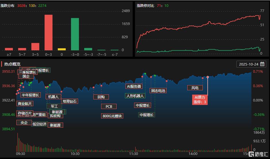 10月24日,沪指创10年新高,创业板指领涨。全市场成交额1.99万亿元,较前一交易日增量3309亿元,超3000股上涨。存储芯片、CPO、半导体等板块涨幅 居前,煤炭、油气等下跌。 | 代码 | 名称 | 价格 | 涨跌 | | 涨幅� 换手% 几天几板[2 ... | 成交额 | 成交量 涨停分析 | | --- | --- | --- | --- | --- | --- | --- | --- | | 300128 | 锦富技术 | 7.36 | +1.23 | | +20.07% 13.71% 自板涨停 | 12.51 7, | 177.9万 人形机器人+扫 | | 300903 | 科邦股份 | 14.76 | +2.46 | +20.00% | 16.54% 自板张停 | 7.5517. | 54.30万 PCB+AI服务器 | | 688766 | 普冉股份 | 142.87 | +23.81 | +20.00% | 10.74% 首板涨停 | 21.49 7. | 15.90万 拟收购+存储芯 | | 300475 | 查农芯创 | | 127.57 +21.26 +20.00% | | 13 ...
