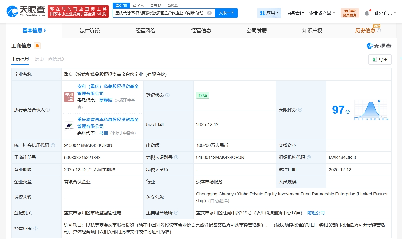 天眼查App显示,近日,重庆长渝信和私募股权投资基金合伙企业(有限合伙)成立,执行事务合伙人 为安和(重庆)私募股权投资基金管理有限公司、重庆渝富资本私募股权投资基金管理有限公司,出资 额10.02亿人民币,经营范围为以私募基金从事股权投资。合伙人信息显示,该基金由重庆战略性新兴 产业股权投资基金合伙企业(有限合伙)、建信信托有限责任公司、长安汽车等共同出资。 ...