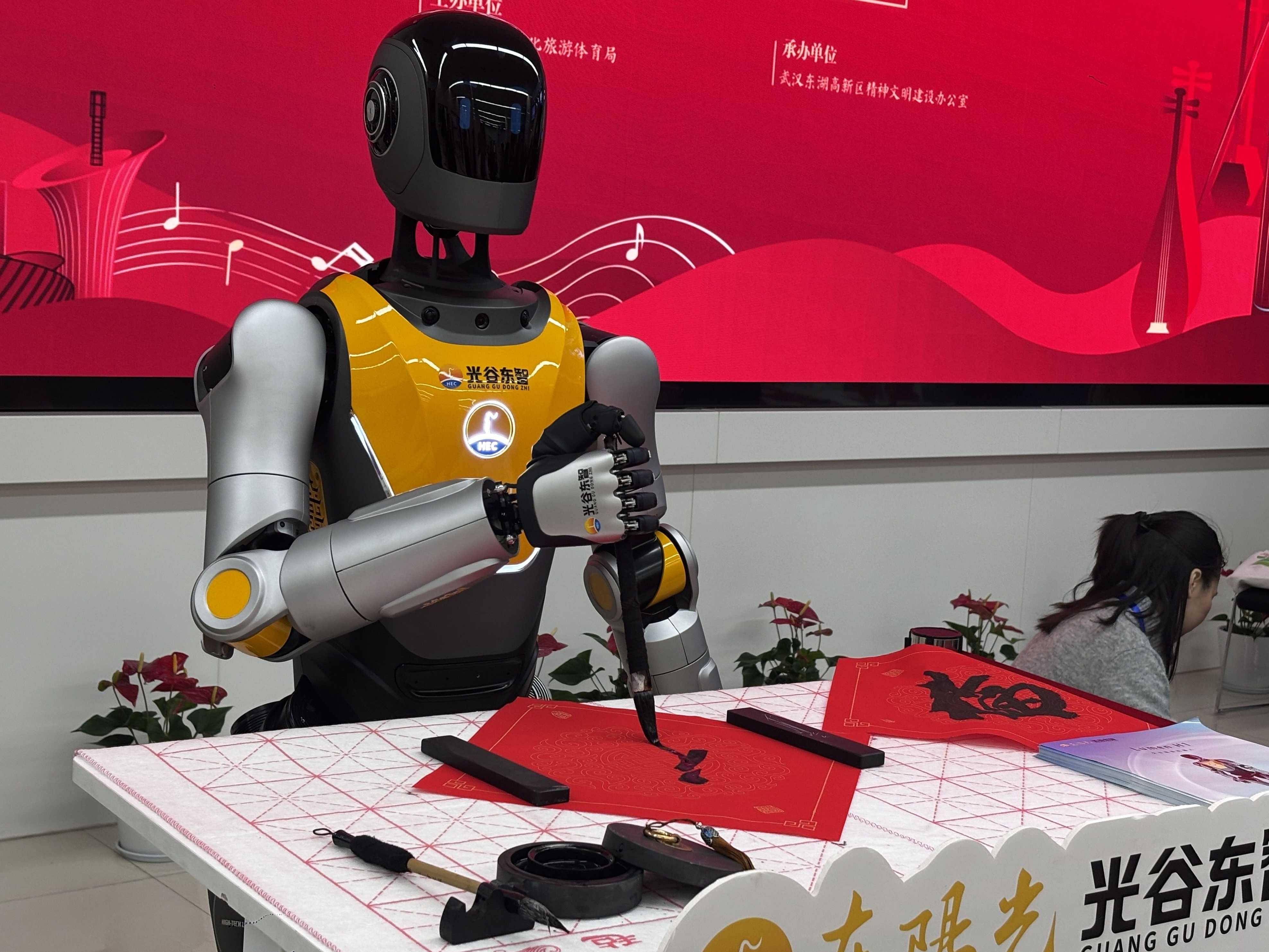 1月30日上午,武汉东湖新技术开发区政务服务中心的大厅里洋溢着科技感十足的年味。由湖北光谷东智具身智能技术有限公司(以 下简称"光谷东智")打造的人形机器人"光子Lumen H1",正手握毛笔在红纸上挥毫书写"福"字,吸引了众人排队领取、拍照围观。 九派新闻记者看到,这台身高近1.7米的人形机器人手腕运转灵活,起笔落纸稳健从容,"福"字一笔一画苍劲有力。活动现场,它与书 法家共同为办事群众写春联、送祝福,在传统习俗中注入科技温度。 人形机器人"光子Lumen H1"给市民写"福"字。 "好惊喜!感觉机器人开始走入千家万户了!"在政务大厅办理身份证过期业务的吴女士笑着说。她注意到,这台机器人手腕活动灵 活,书写时严格遵循笔画顺序,效果丝毫不逊于人工书写。吴女士表示,这是自己第一次近距离接触人形机器人,期待未来这类机器人不 仅能走进政务大厅,还能进入家庭,为人们分担做饭等家务劳动。 光谷政务服务中心负责人李晓慧向记者介绍,这是"光子Lumen H1"首次走进光谷政务大厅。她表示,将人工智能引入公共服务是一次 创新尝试:"我们希望办事群众既能感受到科技的高效,也能体会到服务的温度。"李晓慧透露,未来中心还将围绕"人 ...