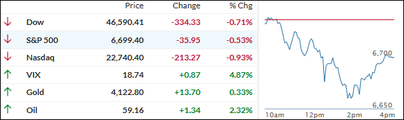 Following the lackluster performance seen during Tuesday's session, stocks moved mostly lower during trading on Wednesday. The major averages all moved to the downside on the day, with the Dow pulling back off yesterday's record closing high.The major averages climbed well off their worst levels in late-day trading but remained firmly negative. The Nasdaq slumped 213.67 points or 0.9 percent to 22,740.40, the Dow slid 334.33 points or 0.7 percent to 46,590.41 and the S&P 500 fell 35.95 points or 0.5 percen ...