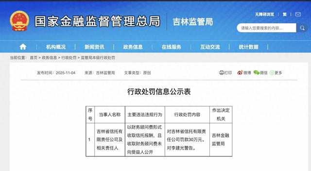 11月4日,据吉林省金融监督管理局发布的行政处罚信息公示表,吉林省信托有限责任公司及其相关责任人因违法违规行为受到处罚。 具体来看,吉林省信托有限责任公司因以财务顾问费形式收取信托报酬,并且未向受益人公开收取的财务顾问费,受到罚款30万元的行政处罚。同时,李建 光因其在此事件中的责任被给予警告。 编辑 信嘉毅 校审胡伟洪 监制 陈姝 | 国家金融监督管理总局 | | 吉林监管局 | 无障碍浏览 繁 区 | | --- | --- | --- | --- | | | | | C 请输入您要搜索的内容 .. | | C 机构概况 | 新闻资讯 | 互动交流 | 统计数据 | | 当前位置:首页 > 政务信息 > 行政处罚 > 主要职责 局领导 | 监管局本级行政处罚 机构设置 联系方式 | | | | 发布时间:2025-11-04 | 来源:吉林监管局 文章类型:原创 | | 昌打印 6 微博 �微信 丹更多 | | | | 行政处罚信息公示表 | | | | 序 当事人名称 主要违法违规行为 름 | 行政处罚内容 | 作出决定 机关 | | | 以财务顾问费形式 吉林省信托有 收取信托报酬,且 1 限责任公司 ...