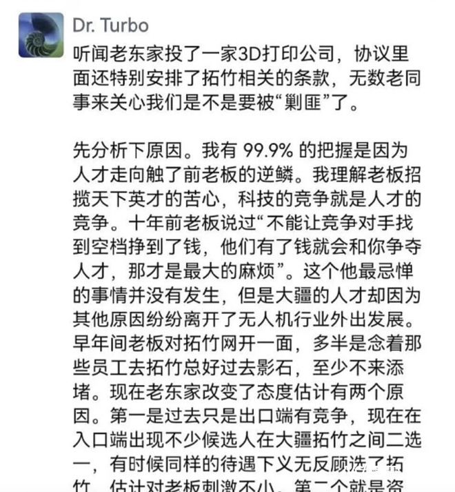 2025 年 11 月,拓竹科技创始人陶冶一条朋友圈长文引发行业震动。他直指老东家大疆投资 3D 打印赛 道竞争对手,且协议中设有针对拓竹的特殊条款,直言 "99.9% 的把握,是因为人才走向触了前老板的 逆鳞"。 拓竹科技创始人陶冶朋友圈长文 这番 "吐槽" 不仅揭开了企业间的人才竞争暗线,更让 "大疆系" 创业者这一群体再次聚焦在聚光灯下 —— 这些从全球无人机巨头走出的人才,正带着 "大疆方法论" 在 3D 打印、储能、机器人等多个硬科 技赛道开疆拓土,成为中国智能制造升级的重要力量。 从 3D 打印到机器人 "大疆系" 明星项目遍地开花 作为 "大疆系" 创业的典型代表,拓竹科技本身就是一部硬核成长史。2020 年,陶冶与四位大疆核心成 员共同创立拓竹科技,短短四年间,公司年收入从 27 亿元跃升至超50亿元,增量占全球消费级 3D 打 印行业增长的一半。 不只拓竹,"大疆系" 创业者已在多个细分赛道打造出独角兽级项目。曾主导大疆电池研发部的王雷, 2017 年创办正浩创新,直击 C 端用户 "充电焦虑" 痛点,2019 年推出的 DELTA 储能产品,快充功率是 当时同级别产品的 10-20 倍,1 ...