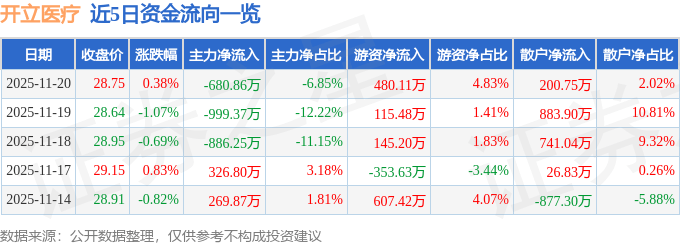 股票行情快报:开立医疗(300633)11月20日主力资金净卖出680.86万元