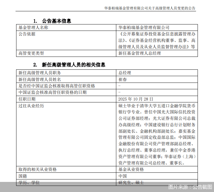 北京商报讯(记者 李海媛)10月28日,华泰柏瑞基金公告称,崔春自当日起担任公司总经理,公司董 事长贾波不再代行总经理职责。 此前在5月9日,华泰柏瑞基金原总经理韩勇因工作调整原因离任,由董事长贾波代任。10月24日,华泰 证券(上海)资产管理有限公司(以下简称"华泰资管")也公告称,董事长崔春因工作变动离任,由公 司董事、总经理江晓阳代任董事长。 据了解,崔春加入华泰资管前,曾供职于光大证券、中国建设银行、嘉实基金、中金公司等知名金融机 构,拥有丰富的金融行业从业经验。 | 新任高级管理人员职务 | 总经理 | | --- | --- | | 新任高级管理人员姓名 | 崔春 | | 是否经中国证监会核准取得高管任职资格 | | | 中国证监会核准高管任职资格的日期 | - | | 任职日期 | 2025年10月28日 | | 过往从业经历 | 硕士毕业于清华大学五道口金融学院货币 | | | 银行学专业。曾任中国光大国际信托投资 | | | 公司证券部经理:光大证券有限公司总裁 | | | 办高级经理:中国建设银行总行计划财务 | | | 部副处长、金融机构部副处长;嘉实基金 | | | 管理有限公司固定收 ...