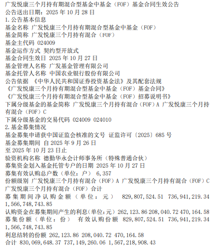 广发悦康三个月持有混合FOF成立 规模15.67亿元