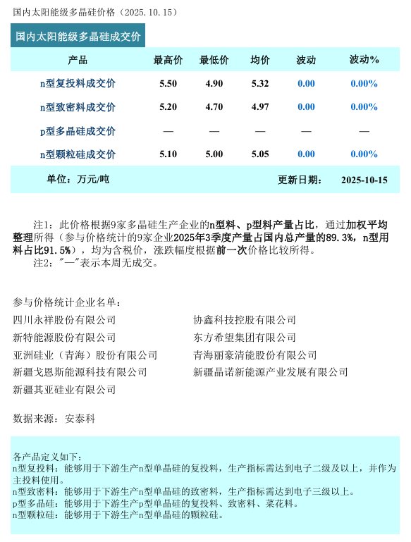智通财经APP获悉,10月15日,硅业分会发文称,本周国内多晶硅市场成交整体清淡,签单量环比有所 下降,主流签单企业减少至2-3家。据安泰科统计,本周多晶硅n型复投料成交价格区间为4.9-5.5万元/ 吨,成交均价为5.32万元/吨,环比持平。n型颗粒硅成交价格区间为5.0-5.1万元/吨,成交均价为5.05万 元/吨,环比持平。 本周在产多晶硅企业增至11家,其中包含一家检修复产企业。据硅业分会统计,9月份国内多晶硅产量 约12.9万吨,环比增加5.3%,同期多晶硅消费量约11.6万吨,环比增加3.4%,当月累库约1.2万吨(含进 出口)。2025年前三季度,国内多晶硅累计产量95.6万吨,同比减少35.1%,同期多晶硅消费量约96.4万 吨,同比下降20.1%。今年前9个月,国内多晶硅行业累计去库约1.2万吨(含进出口)。根据10月份企业排 产计划,国内多晶硅产量预计在13万吨左右,环比增幅有所收窄,同期需求相对稳定,10月份依旧维持 小幅累库预期。 数据来源:安泰科 国内太阳能级多晶硅价格(2025.10.15) 各产品定义如下: n型复投料:能够用于下游生产n型单晶硅的复投料,生产指标需达到电子二级及 ...