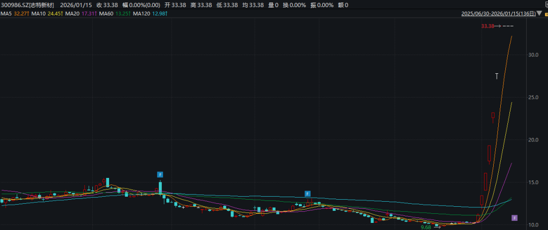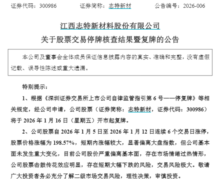 志特新材复牌与股价表现 - 公司股票将于2026年1月16日开市起复牌,此前因股价异常波动自1月13日起停牌核查 [1] - 2026年前6个交易日,公司股价连续6个交易日涨停,累计涨幅近200% [1] - 以最新收盘价计算,公司是2026年A股市场表现最佳的股票,累计涨幅大幅领先第二名 [3] 志特新材市场排名与涨幅数据 - 根据Wind统计数据,截至2026年1月15日,志特新材年涨幅为198.5689%,位列A股第一 [4] - 排名第二的易点天下年涨幅为100.7901%,志特新材涨幅接近其两倍 [4] - 排名第三的锋龙股份年涨幅为94.9211% [4] 志特新材业务与基本面澄清 - 公司核查结果显示,业务不涉及AI应用、人工智能、量子科技、机器人及商业航天领域,亦未形成相关收入 [4] - 自上市以来,公司主营业务始终为铝模、防护平台、装配式预制件等产品的研发、生产与销售,未发生变化 [4] - 公司及子公司生产经营正常,不存在应披露而未披露的重大信息 [4] 志特新材近期财务表现 - 2024年度公司实现营业收入25.26亿元,归属于上市公司股东的净利润为7369.51万元 [5] - 2025年前三季度公司实现营业收入20.23亿元,归属于上市公司股东的净利润为1.18亿元 [5] - 公司营业收入全部来源于铝模、防护平台、装配式预制件等主营业务产品 [5] *ST铖昌复牌与股价表现 - 与志特新材同一天宣布停牌核查的*ST铖昌也已核查完毕,股票将于2026年1月16日复牌 [6] - 公司主营业务及经营情况未发生重大变化,不存在应披露而未披露的重大信息 [6] - 自2025年11月下旬以来,公司股价累计涨幅超过180% [6] *ST铖昌交易异常波动详情 - 截至2026年1月12日收盘,公司股票交易连续10个交易日内4次出现同向异常波动,属于严重异常波动 [6] - 在本次停牌前的7个交易日,公司股票连续涨停 [6] - 2026年1月12日,*ST铖昌收盘价为122.84元,当日涨幅为5.00% [7]