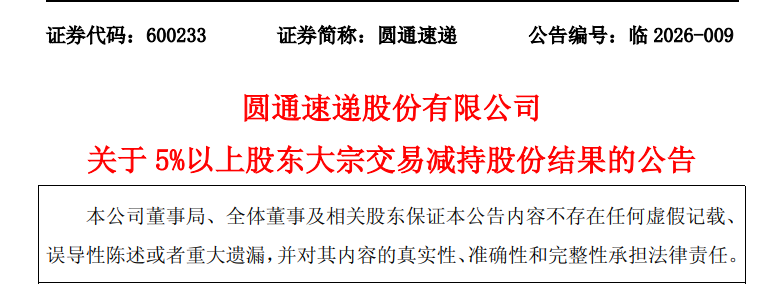 股东减持计划实施结果 - 股东杭州灏月企业管理有限公司在本次减持计划实施前,持有公司310,244,613股无限售条件流通股,占公司总股本的9.06% [2] - 该股东于2025年10月17日披露减持计划,计划通过大宗交易方式转让不超过68,450,994股,拟转让比例不超过公司总股本的2% [3] - 减持计划已实施完毕,在2025年11月7日至2026年1月19日期间,通过大宗交易方式实际转让公司股份68,450,994股,占公司总股本的2% [3] - 本次减持计划的实施遵守了相关法律法规,实际减持情况与此前披露的计划一致,且未提前终止或违反承诺 [3] 2025年12月快递业务经营数据 - 公司于2026年1月20日公告了2025年12月的快递业务主要经营数据 [4] - 公告中提及的经营数据未经审计 [4]
