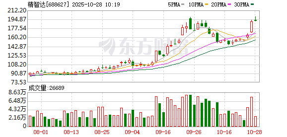两融数据显示,该股最新(10月27日)两融余额为5.24亿元,其中,融资余额为5.24亿元,近10日减少 1.01亿元,环比下降16.15%。 公司发布的半年报数据显示,上半年公司共实现营业收入4.44亿元,同比增长22.68%,实现净利润 3058.70万元,同比下降19.94%,基本每股收益为0.3300元,加权平均净资产收益率1.78%。(数据宝) (文章来源:证券时报网) 精智达股价创出历史新高,截至9:47,该股上涨4.64%,股价报199.11元,成交量162.98万股,成交金额 3.19亿元,换手率2.25%,该股最新A股总市值达187.19亿元,该股A股流通市值144.06亿元。 证券时报·数据宝统计显示,精智达所属的机械设备行业,目前整体跌幅为0.25%,行业内,目前股价上 涨的有276只,涨停的有标准股份、厦工股份等3只。股价下跌的有296只,跌幅居前的有信邦智能、达 意隆、神开股份等,跌幅分别为8.87%、6.29%、6.05%。 ...