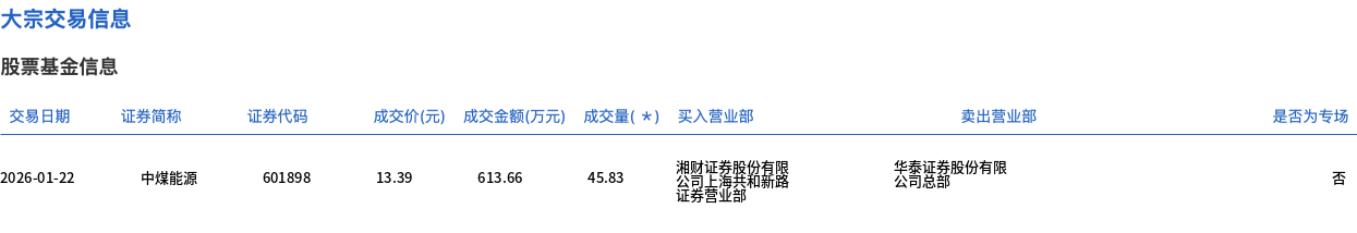 1月22日,中煤能源大宗交易成交45.83万股,成交额613.66万元,占当日总成交额的1.19%,成交价13.39元,较市场收盘价13.39元持平。 | 交易日期 | 证券简称 | 证券代码 | 成交价(元) 成交金额(万元) 成交量( * ) 买入营业部 | | | | 卖出营业部 | | --- | --- | --- | --- | --- | --- | --- | --- | | 2026-01-22 | 中煤能源 | 601898 | 13.39 613.66 | 45.83 | 温财证券股份有限 | 华泰证券股份有限 公司总部 | | ...