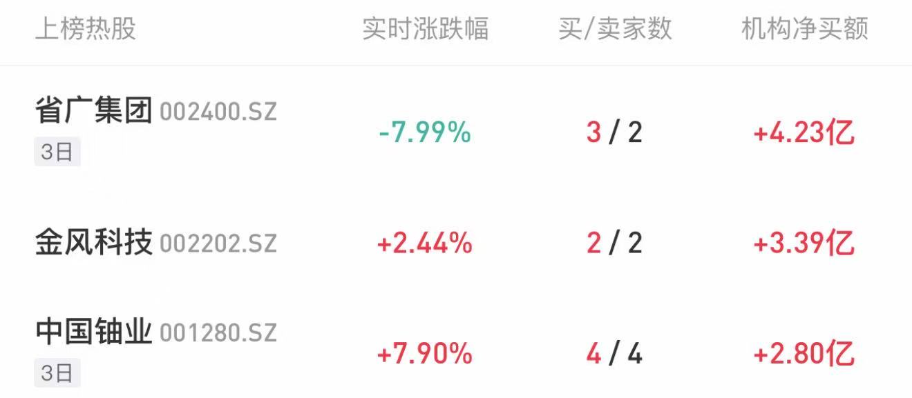 3日龙虎榜显示,4家机构净买入2.8亿。 龙虎榜机构热股 今天机构龙虎榜上榜49只个股,净买入29只,净卖出20只。当日机构买入最多的个股前三位是:省广集团(3日4.23亿)、金风科技(3.39亿)、中国铀业 (3日2.8亿)。 | 上榜热股 | 实时涨跌幅 | 买/卖家数 | 村 | | --- | --- | --- | --- | | 省广集团 002400.SZ | -7.99% | 3/2 | | | 3日 | | | | | 金风科技 002202.SZ | +2.44% | 2/2 | | | 中国德业 001280.SZ | +7.90% | 4/4 | | | 3日 | | | | 中国铀业 森源电气 个股龙虎榜 二、航天 海格通信 中国铀业是专注于天然铀和放射性共伴生矿产资源综合利用业务的矿业公司。 国泰海通证券表示,从需求端来看,全球天然铀需求增长的核心驱动力来自核能建设发展,根据WNA预测,中性预测下,到2040年全球反应堆铀需求预计 将增加至15.05万tU,在全球能源清洁转型和核电加速建设发展的推动下,天然铀供需缺口预计长期存在,公司有望长期受益。 龙虎榜知名游资 一、电网 1月1 ...