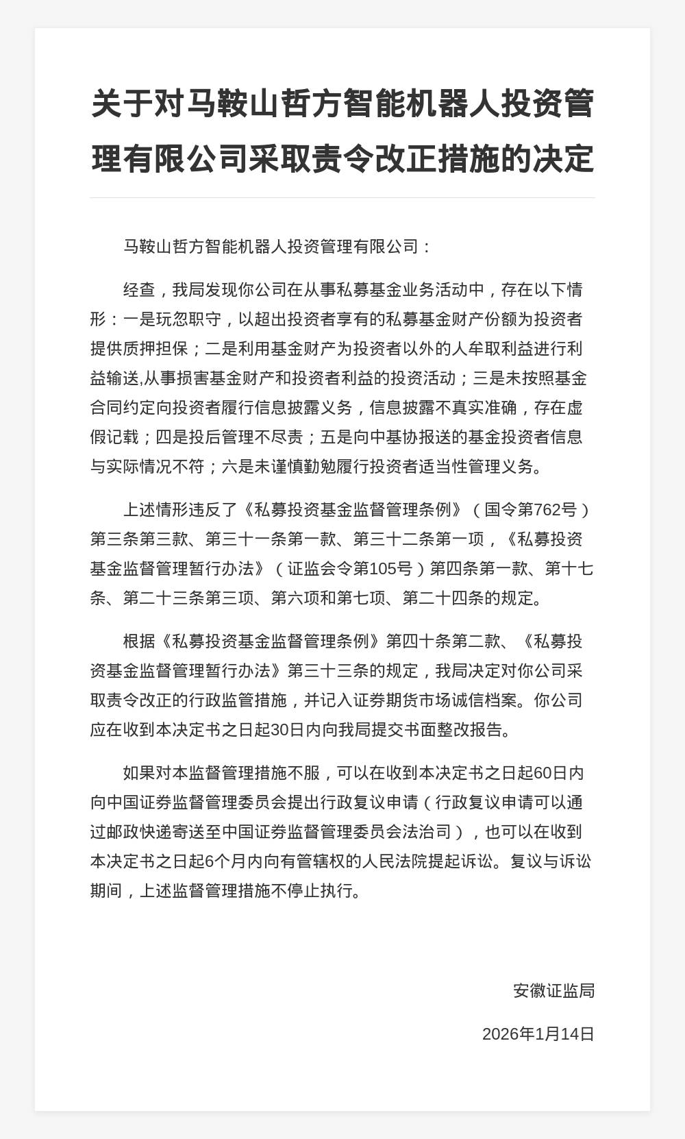 马鞍山哲方智能机器人投资被责令改正,涉私募基金业务多项违规