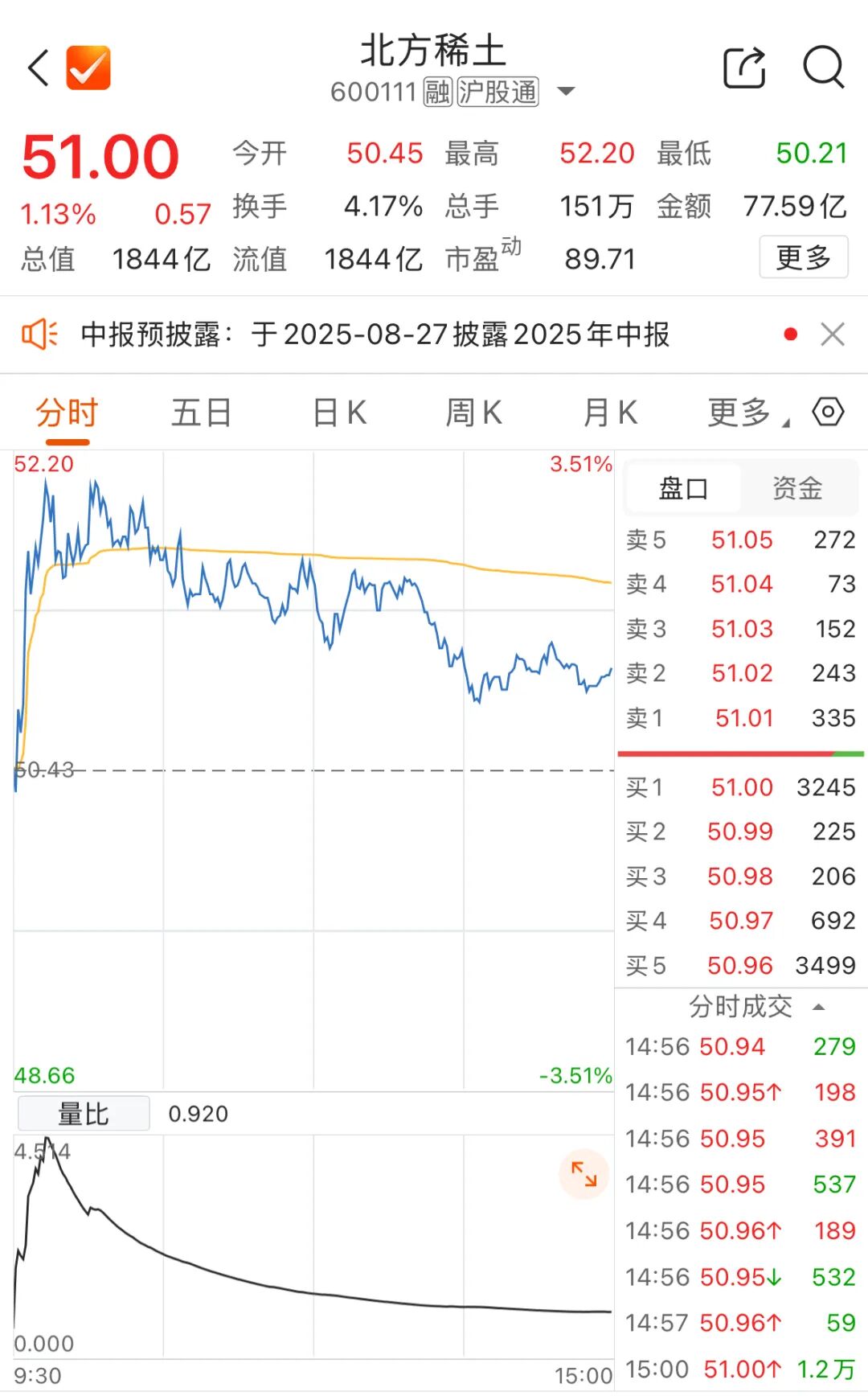 北方稀土(600111.SH)发预增,预计2025年度归母净利润21.76亿元到23.56亿元,同比增加116.67%到134.60%