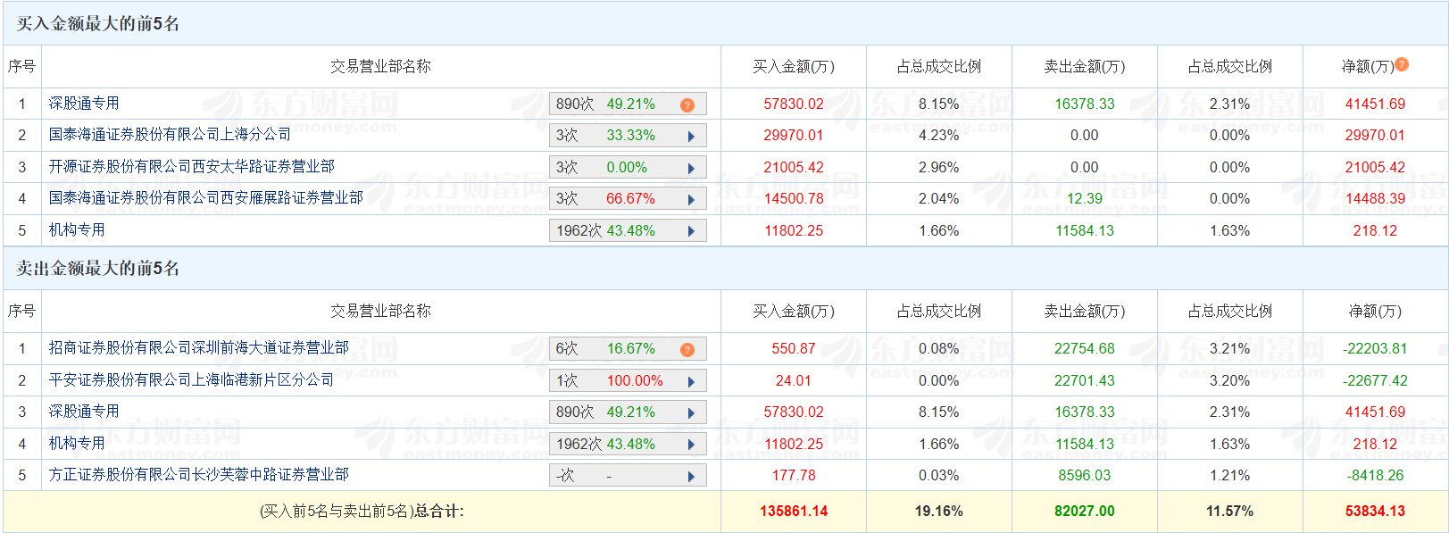 | 交易日期 | 证券代码 | 证券简称 | 成交价格 | 成交量 | 成交金额 买方营业部 | | 卖方营业部 | | --- | --- | --- | --- | --- | --- | --- | --- | | | | | (元) | (万股/万份) | (万元) | | | | 2026-01-23 | 300059 | 东方财富 | 18.66 | 18.50 | 345.21 光大证券股份有限 | | 光大证券股份有限 | | | | | | | | 公司东莞南城鸿福 | 公司东莞南城鸿福 | | | | | | | | 路班券营业部 | 路班弟营不部 | 1月23日,东方财富大宗交易成交18.5万股,成交额345.21万元,占当日总成交额的0.06%,成交价18.66 元,较市场收盘价23.3元折价19.91%。 ...