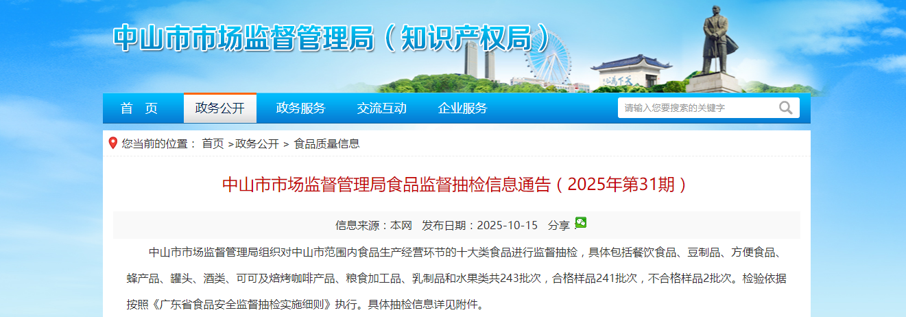 中山市市场监督管理局组织对中山市范围内食品生产经营环节的十大类食品进行监督抽检,具体包括餐饮食品、豆制品、方便食品、蜂产品、罐头、酒类、 可可及焙烤咖啡产品、粮食加工品、乳制品和水果类共243批次,合格样品241批次,不合格样品2批次。检验依据按照《广东省食品安全监督抽检实施细 则》执行。具体抽检信息详见附件。 欢迎广大消费者积极参与食品安全监督工作,关注每期食品抽检信息公布,如发现危害社会公众的食品及其违法行为,请及时拨打中山市市场监督管理局举 报投诉电话12345。 特此通告。 2.食品监督抽检合格信息表(2025年第31期) 3.食品监督抽检不合格信息表(2025年第31期) 4.关于部分检验项目的说明 中山市市场监督管理局 2025年10月15日 | 食品监督抽检不合格信息表(2025年第31期) | | | | | | | | | | | | | | | | | | --- | --- | --- | --- | --- | --- | --- | --- | --- | --- | --- | --- | --- | --- | --- | --- | --- | | | | | | | | | ...