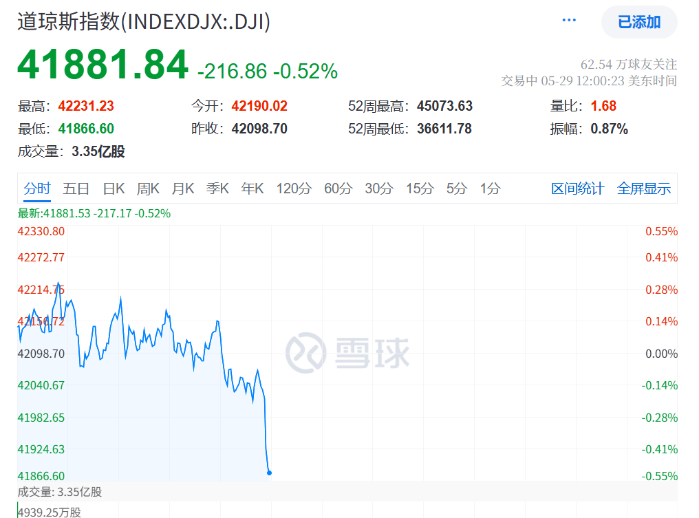 【导读】特朗普政府请求上诉法院暂停关税裁决 中国基金报记者 泰勒 大家好,今晚继续关注海外市场的表现! 美股跳水 随后不久,美股三大指数跳水。 | 纳斯达克综合指数(NASDAQ:.IXIC) | | | | 加自选 | | --- | --- | --- | --- | --- | | 19106.14 +5.20 +0.03% | | | 交易中 05-29 12:00:32 美东时间 | 33.39 万球友关注 | | 最高:19389.39 | 今开:19389.39 | 52周最高: 20204.58 | 量比: 1.84 | | | 最低:19110.71 | 昨收:19100.94 | 52周最低: 14784.03 | 振幅:1.46% | | | 成交量: 66.22亿股 | | | | | | 分时 五日 日K 周K 月K 季K 年K 120分 60分 30分 15分 5分 1分 | | | 区间统计 全屏显示 | | | 最新:19106.14 +5.20 +0.03% | | | | | | 19389.39 | | | | 1.51% | | | | | | 1.13% | | 19 ...