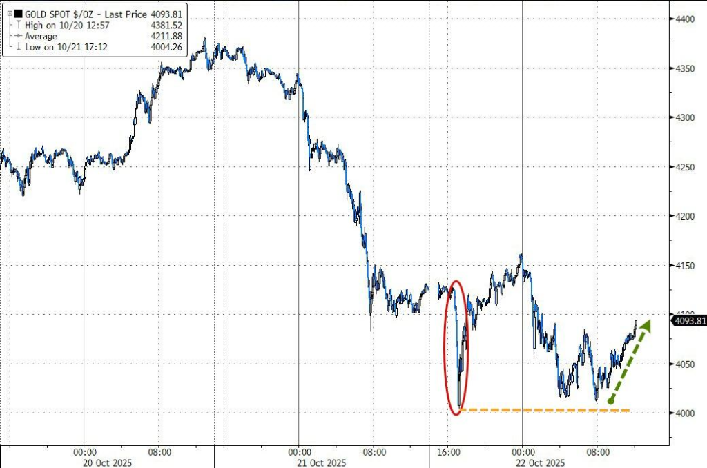 央行季节性购买: 在经历平静的夏季后(8月央行购买仅21吨),央行购买在9月和10月可能出现季节性回升,这与往年夏季后的加速模式一致。 尽管本周黄金价格一度累跌超8%,但高盛依然保持坚定的看涨立场。 追风交易台消息,10月22日,高盛分析师Lina Thomas和Daan Struyven发表研报,重申其2026年底4900美元/盎司的目标价,并强调这一预测甚至 存在"上行风险"。 高盛认为,当前的抛售主要是由投机性头寸平仓和白银市场的溢出效应导致,并非基本面恶化。真正的"聪明钱",包括各国央行、超高净值人士 和长期资产配置机构在内的结构性买盘仍在持续流入。 高盛进一步强调由于大型机构投资者配置需求的苏醒,4900美元/盎司的目标价甚至存在"上行风险"。周三现货黄金一度跌至4000美元关口上方, 但随后受支撑反弹。 (周三现货黄金4000美元上方宽幅震荡) 结构性买盘支撑金价上涨逻辑 与投机性资金的快进快出形成鲜明对比,高盛强调,支撑金价长期走牛的"粘性"(sticky)结构性需求在9月至10月期间依然强劲。 高盛指出,这些"粘性"资金流主要来自: 在美联储降息预期和投资组合多元化需求的双重驱动下,黄金ETF ...