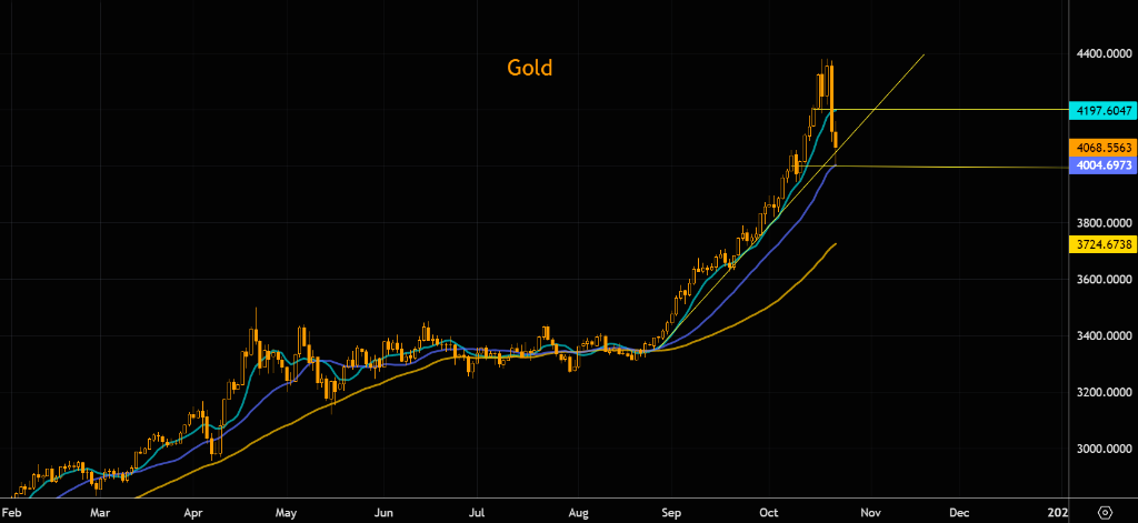 在经历隔夜市场的急剧抛售后,贵金属市场的紧张情绪陡然升温。 周二,现货黄金价格盘中一度暴跌6.3%,创下逾12年来最大单日跌幅,这一波动被视为"5西格玛"级别的罕见事件。金价一度下探4000美元整数关 口,该水平恰好与其21日移动平均线重合。尽管金价随后有所反弹,但仍面临显著压力。从技术层面看,4000美元是黄金当前最重要的支撑。若 黄金跌破4000美元,下方支撑或在3800美元。 据高盛分析,此次暴跌并无"明显的导火索",主要源于市场在连续上涨后,多头头寸变得异常拥挤。高盛交易员将黄金的走势图形容为如同崩盘 的"妖股"(meme stock)。交易员正密切关注黄金每盎司4000美元与白银每盎司48美元这两个关键技术关口,它们的得失将为市场短期走向提供 决定性指引。 黄金:4000美元成关键分水岭 技术图表显示,黄金价格已运行至"远低于"8日移动平均线的水平,显示出短期下行压力。 金价在隔夜低点精确测试了4000美元的支撑,该水平不仅是重要的心理关口,也是21日移动平均线所在位置。此后,金价虽小幅反弹,但目前恰 好交投于自今年9月以来形成的一条上升趋势线上,表明多空双方正在此激烈博弈。 从技术层面看,4000 ...