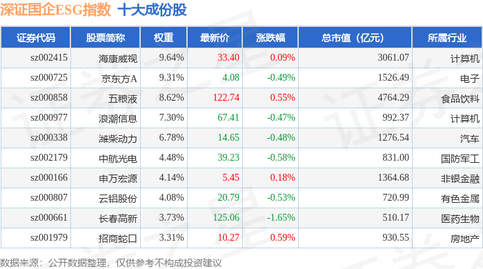 | 证券代码 | 股票简称 | 权重 | 最新价 | 涨跌幅 | 总市值(亿元) | | 所属行业 | | --- | --- | --- | --- | --- | --- | --- | --- | | sz002415 | 海康威视 | 9.64% | 33.40 | 0.09% | | 3061.07 | 计算机 | | sz000725 | 京东方A | 9.31% | 4.08 | -0.49% | | 1526.49 | ● 电子 | | sz000858 | 五根液 | 8.62% | 122.74 | 0.55% | | 4764.29 | 食品饮料 | | sz000977 | 浪潮信息 | 7.30% | 67.41 | -0.47% | | 992.37 | 计算机 | | sz000338 | 潍柴动力 | 6.78% | 14.65 | -0.48% | | 1276.54 | 汽车 | | sz002179 | 中航光电 | 4.48% | 39.23 | -0.58% | | 831.00 | 国防车】 | | sz000166 | 申万宏源 | 4.14% | 5.45 | ...