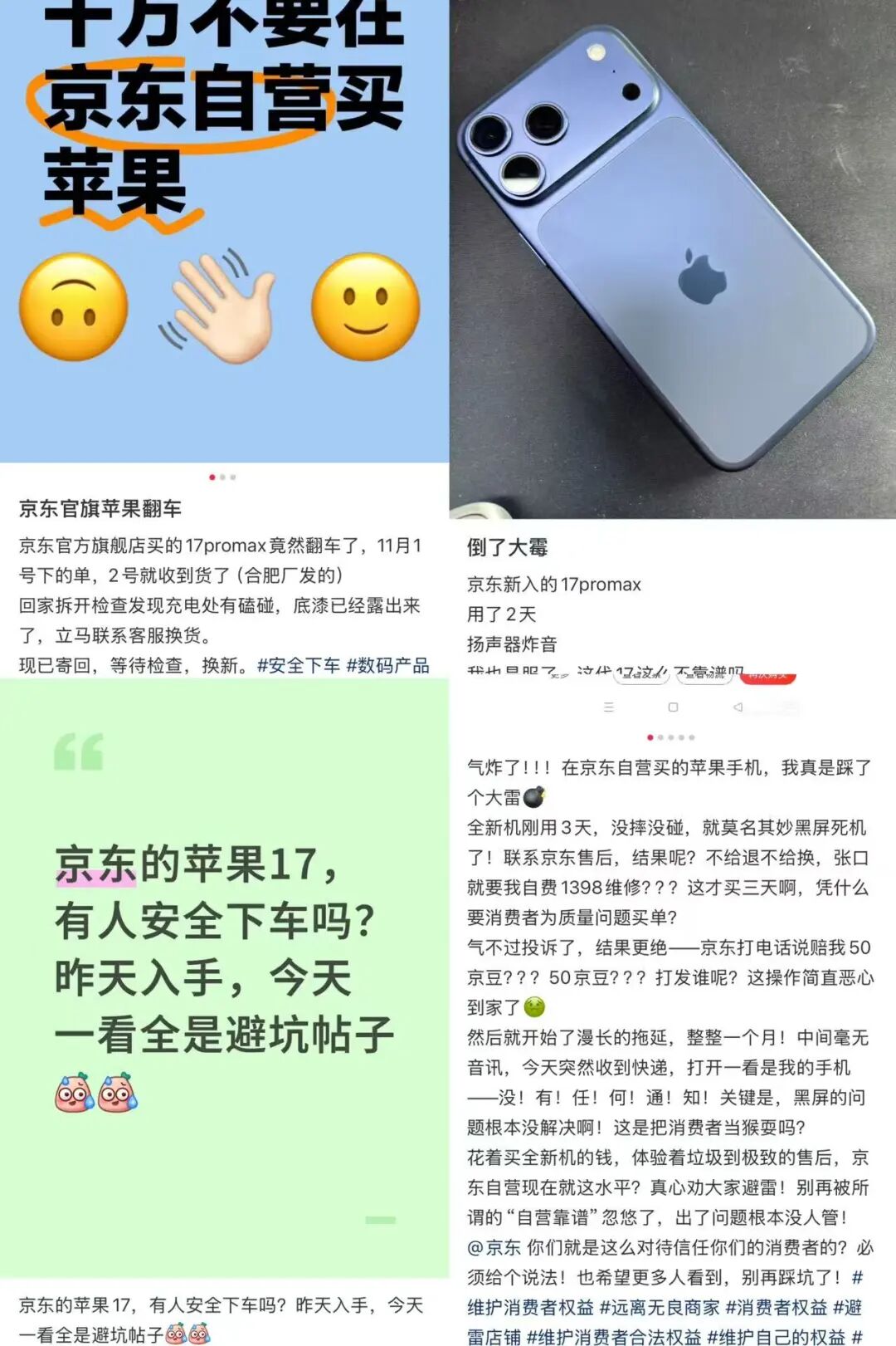 iPhone 17系列市场表现 - iPhone 17系列需求远超预期,消费者反响非常强劲 [1] - 上市10天内,iPhone 17系列销量比iPhone 16系列高出14% [1] - 上市前六周,iPhone 17系列相较上一代同期销量整体增幅达到38% [1] - 标准版iPhone 17销量同比飙升116% [1] 京东自营iPhone 17质量问题与售后争议 - 社交媒体和投诉平台出现大量用户反映在京东自营购买iPhone17存在质量问题及维权难的帖子 [1][5] - 消费者案例:iPhone 17 Pro Max刚收货即出现“爆音”问题,苹果直营店检测确认存在质量问题并建议退换,但京东依据“北京博辉在线”的检测报告(故障未复现)拒绝退换货 [7][8] - 黑猫投诉平台及中国文书网显示,京东多次以北京博辉在线出具的“未发现问题”等检测报告为由,拒绝消费者的退换货或维修诉求 [8][13] - 法院在相关判决中认定京东提交的北京博辉在线检测报告未能针对具体故障进行符合国家标准的检测,报告无效,判决京东承担退货退款责任 [14][15] 电商平台苹果产品销售模式差异 - 京东自营是苹果授权的线上经销商,而抖音、天猫是苹果官方直营的旗舰店 [16] - 官方直营店提供7天无理由退换货及14-15天质量问题退换服务,售后服务由苹果公司负责 [17] - 京东自营店规定拆封激活后非质量问题不支持7天无理由退换,有质量问题需经检测,但检测环节易陷入消费者认为有问题而京东检测方认定无问题的循环 [17] 京东自营模式分析 - 京东自营模式由平台作为大经销商负责采购和销售,自营零售是京东集团的营收大头,尤其是手机等通电类产品占据半壁江山 [20][21] - 自营模式面临品控和售后服务压力,京东子公司上海圆迈贸易有限公司在2025年多次因销售不合格产品等问题收到监管部门罚单 [23] - 自营模式下,京东向商家索取推广费、服务费等并确保自身毛利(如对小品牌要求至少10%毛利及货价10%的广告投放),商家利润受挤压,压力可能传导至生产及售后环节 [21][22] - 自营模式在品控丰富度及成本控制上存在挑战,被认为是困住京东的枷锁,导致与消费市场需求错位 [21][23]